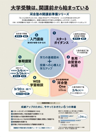 河合塾の開講前準備シリーズ「もっと上をめざしたいけど、本当に学力がアップするのかな…」こんな不安はありませんか?河合塾は開講前から、来春の合格をめざす皆さんの学習をしっかりサポートします。さあ!大学受験はもう始まっています。河合塾の開講前準備シリーズで、誰よりも早く学習をスタートしましょう!各校舎で開催要申込無料入門講座数学Ⅲ・物理・化学・古文スタートガイダンス入塾申込者限定各校舎で開催要申込要無料授業スタート3/28〜入塾手続完了後すぐ利用可能要申込有料専用自習室の利用学力の基礎固め授業への心構えと学力アップ春期講習3/19〜授業スタート相談開始映像授業3/6(木)〜対面授業3/24(月)〜事前予約無料要申込有料3/20(木・祝)〜相談開始事前予約無料WEB学習相談河合塾講師監修河合塾OneAⅠ学習ツールで基本分野を補強入塾手続完了後2/4(火)〜すぐに学習スタート!4.82UP1.64UP約3倍の差!9.50UP2.89UP取り組んだ取り組んでいない英語数学