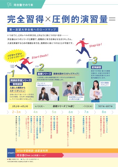 完全習得×圧倒的演習量=第一志望大学合格へのロードマップいつまでに、どのレベルの学力を、どのように身につけるべきか―河合塾は4つのシリーズと講習で、段階的に学力を伸ばせるカリキュラム。入試を突破するための強固な学力を、効果的に身につけることが可能です。STEP22基礎シリーズ基礎を固めてステップアップ!入試突破に必要な基礎知識を学び、学力の土台を固めます。高校3年間の学びを高度に再構築します。チューターと学習計画を立てよう!STEP11開講前準備シリーズ/春期講習入塾した瞬間からスタートダッシュ!STEP33夏期講習夏までの学習・個々の課題を踏まえ、志望大学対策や苦手の徹底克服のための集中講義を行います。自分の課題をクリアしよう!2月上旬〜4月上旬4/13(月)〜基礎シリーズ[14講]〜7/23(木)7月下旬〜8月下旬8月●開講チュートリアル●第2回全統記述模試●夏期国立大入試オープン7月●第2回全統共通テスト模試●第2回サクセス・クリニック●夏期面談(三者面談)6月●思考力・表現力テスト●夏期学習計画立案●第1回共通テスト対応力トレーニング5月●第1回全統記述模試●第1回保護者会●第1回全統共通テスト模試●プライムステージ●春期面談(二者面談)●基礎シリーズ学習計画立案●学びみらいPASS(特徴診断テスト)●開講チュートリアル●第1回サクセス・クリニック(学力診断テスト)●先行スタートプログラム●河合塾One(A学習ツール)※2〜3月4月合格に向けて良いスタートを切るための期間。1日も早く学習を開始し、ライバルに差をつけましょう。完全習得タイムがあるから学びが定着!START!WEB学習相談・自習室利用河合塾One(A学習ツール)※詳細は模試・校内テストチューターによるサポート※6月以降の利用は、別途申込が必要です(有料)。