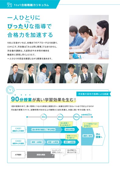 一人ひとりにぴったりな指導で合格力を加速する100人生徒がいれば、合格までのアプローチは100通り。だからこそ、河合塾は「みんな同じ授業」ではありません。河合塾の講師は、入試形式や大学別の傾向を徹底的に研究し尽くしたうえで、一人ひとりの反応を確認しながら授業を進めます。90分授業が高い学習効果を生む!河合塾の長年の指導による結論1回の授業の中で、深い理解につながる解説と演習を行い、知識を活用できるレベルまで引き上げるのが河合塾の授業スタイル。試験時間が90分以上の難関大入試を見据え、本番に強い学力を養います。30分60分90分休憩時間20分1回の授業で学力定着度UP!じっくり質問ができて疑問解消!基本事項の確認と丁寧な解説演習&解説演習にたくさん取り組める!講師に質問次の授業へ演習①&解説演習②&解説演習③&解説CASE1講義中心の授業CASE2演習中心の授業A予備校演習&解説もっとじっくり解説してほしい…他の問題でも解けるか不安…