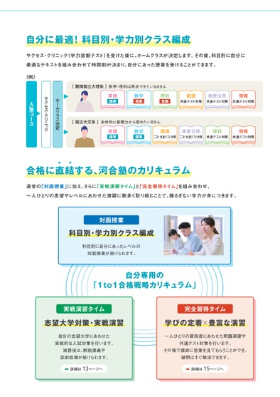 自分に最適!科目別・学力別クラス編成サクセス・クリニック(学力診断テスト)を受けた後に、ホームクラスが決定します。その後、科目別に自分に最適なテキストを組み合わせて時間割が決まり、自分にあった授業を受けることができます。[難関国立大理系]数学・理科は得点できているAさん英語標準数学発展理科発展国語共通テスト対策地歴公民共通テスト対策情報共通テスト対策[国立大文系]全体的に基礎力から固めたいBさん英語標準数学標準国語地歴公民理科情報二次・共通テスト対策二次・共通テスト対策共通テスト対策共通テスト対策ホームクラス決定サクセス・クリニック入塾コース(例)合格に直結する、河合塾のカリキュラム通常の「対面授業」に加え、さらに「実戦演習タイム」と「完全習得タイム」を組み合わせ、一人ひとりの志望やレベルにあわせた演習に数多く取り組むことで、揺るぎない学力が身につきます。対面授業科目別・学力別クラス編成科目別に自分にあったレベルの対面授業が受けられます。自分専用の「1to1合格戦略カリキュラム」実戦演習タイム完全習得タイム志望大学対策・実戦演習学びの定着×豊富な演習自分の志望大学にあわせた実戦的な入試対策を行います。演習後は、解説講義や添削指導が受けられます。詳細は13ページへ一人ひとりの習得度にあわせた問題演習や共通テスト対策を行います。その場で講師に答案を見てもらうことができ、疑問はすぐ解消できます。詳細は15ページへ