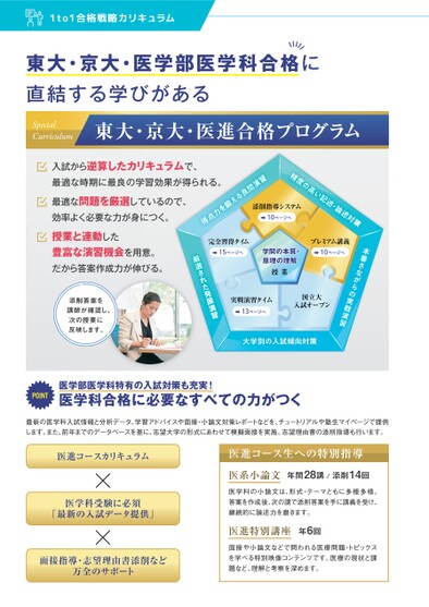 述対策述・論い記プレミアム講義10ページへ本番さながらの実戦演習東大・京大・医学部医学科合格に直結する学びがあるSpecialCurriculum東大・京大・医進合格プログラム度の高精習演問良添削指導システム10ページへ入試から逆算したカリキュラムで、最適な時期に最良の学習効果が得られる。最適な問題を厳選しているので、効率よく必要な力が身につく。るえ鍛を力点得完全習得タイム15ページへ学問の本質・原理の理解授業実戦演習タイム13ページへ国立大入試オープン大学別の入試傾向対策された発展演習厳選授業と連動した豊富な演習機会を用意。ら答案作成力が伸びる。だか添削答案を講師が確認し、次の授業に反映します。POINT医学部医学科特有の入試対策も充実!医学科合格に必要なすべての力がつく最新の医学科入試情報と分析データ、学習アドバイスや面接・小論文対策レポートなどを、チュートリアルや塾生マイページで提供します。また、前年までのデータベースを基に、志望大学の形式にあわせて模擬面接を実施。志望理由書の添削指導も行います。医進コースカリキュラム医学科受験に必須「最新の入試データ提供」面接指導・志望理由書添削など万全のサポート医進コース生への特別指導医系小論文年間28講/添削14回医学科の小論文は、形式・テーマともに多種多様。答案を作成後、次の講で添削答案を手に講義を受け、継続的に論述力を磨きます。医進特別講座年6回面接や小論文などで問われる医療問題・トピックスを学べる特別映像コンテンツです。医療の現状と課題など、理解と考察を深めます。
