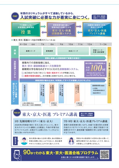 POINT年間のカリキュラムがすべて連動しているから、つ要な力が着実に身く。入試突破に必に東大・京大・選抜制医進コース生限定プロ講師による、本質理解と実戦演習添削指導を繰り返し、答案作成力を磨き上げる出題者の意図をつかみ、得点につなげる基礎シリーズ夏期講習完成シリーズ突破シリーズ/冬期・直前講習本番で勝てる答案作成力の完成!授業と連動した添削指導で実戦力を強化!授業内での添削指導に加え、東大・京大・選抜制医進コース生限定の最難関大学合格をめざすキミにむけた添削指導システム。自己採点では気づきにくい加点・減点ポイントが明確になる。講師が答案を確認し、次の授業に反映するから、さらに伸びる。東大文類コースの添削回数(例)年間合計回英語28回、数学7回、現代文11回、古文11回、漢文11回、日本史16回、世界史16回、地理16回直前期対策(実施例)●大学別、科目別直前対策ゼミ●論述対策ゼミ秋期国立大入試オープン東大・京大・医進プレミアム講義夏期国立大入試オープン東大・京大・医進プレミアム講義先制攻略セミナー実戦演習が組み込まれ、年間通してすべてが連動したカリキュラム・入試の特徴を知る・採点を通じて自身の課題確認本番形式での実戦本番形式での実戦授業添削指導システムプレミアム講義・国立大入試オープンPICKUP東大・京大・医進プレミアム講義東大・京大・選抜制医進コース生限定5月:先制攻略セミナー(東大・京大)7月・9月:東大・京大・医進プレミアム講義2026年2月実施の東大・京大入試にチャレンジし、東大・京大のスペシャリスト講師による解説と、今後の学習方針をアドバイスします。合格までに必要な力をいつ、どのように培えば良いかがわかります。実際の添削答案を使いながら、本番で点数を取れる答案作成のコツをアドバイスします。さらに、模試で到達すべき目標を示すので、最短距離で最難関大学に合格する計画が立てられます。答案を作る前段階での思考の流れを聞いて、疑問を解消できた点が良かったです。他の人の答案も、とても参考になりました。東大英語の細かな分析を聞き、他の受講生の答案を実際に見ることができました。採点基準やポイントを知ることができて良かったです。塾生の声90秒でわかる東大・京大・医進合格プログラム合格に導く5つの対策を動画で紹介します。●東大・京大・医進コース生の年間スケジュール(例)7月4〜5月6月8月9月10月11月12月1〜3月
