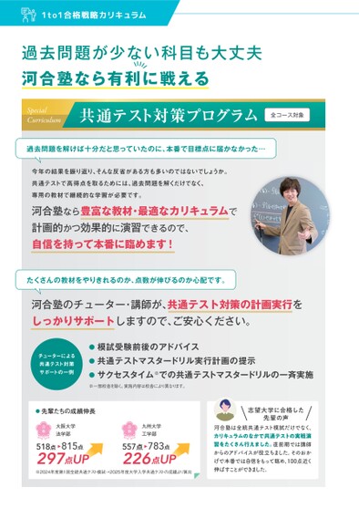 過去問題が少ない科目も大丈夫河合塾なら有利に戦えるSpecialCurriculum共通テスト対策プログラム全コース対象過去問題を解けば十分だと思っていたのに、本番で目標点に届かなかった…今年の結果を振り返り、そんな反省がある方も多いのではないでしょうか。共通テストで高得点を取るためには、過去問題を解くだけでなく、専用の教材で継続的な学習が必要です。河合塾なら豊富な教材・最適なカリキュラムで計画的かつ効果的に演習できるので、自信を持って本番に臨めます!たくさんの教材をやりきれるのか、点数が伸びるのか心配です。河合塾のチューター・講師が、共通テスト対策の計画実行をしっかりサポートしますので、ご安心ください。チューターによる共通テスト対策サポートの一例●模試受験前後のアドバイス●共通テストマスタードリル実行計画の提示●サクセスタイム※での共通テストマスタードリルの一斉実施※一部校舎を除く。実施内容は校舎により異なります。志望大学に合格した先輩の声河合塾は全統共通テスト模試だけでなく、カリキュラムのなかで共通テストの実戦演習をたくさん行えました。直前期では講師からのアドバイスが役立ちました。そのおかげで本番では自信をもって臨め、100点近く伸ばすことができました。557点226点783点UP九州大学工学部合格※2024年度第1回全統共通テスト模試→2025年度大学入学共通テストの成績より算出●先輩たちの成績伸長518点297点815点UP大阪大学法学部合格
