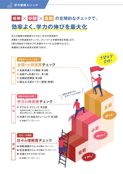 長期中期短期全国のライバルと比較!全国での到達度チェック●全統共通テスト模試年3回●全統プレ共通テスト年1回●全統記述模試年3回●国立大入試オープン(夏期・秋期)長期●共通テスト対応力トレーニング年3回詳細は11・12ページへ学力の伸長度チェック●サクセス・クリニック年2回各教科を分野ごとに細分化したテストで、弱点を明らかにし、真の課題を洗い出します。中期過去の自分と比較!日々の理解度チェック●実戦演習タイム●完全習得タイム●共通テストマスタードリル詳細は13ページへ詳細は15・16ページへ短期詳細は11・12ページへできた!を確認日々の授業の理解度だけでなく、学力の伸長度や目標までの到達度をチェックし、チューターと学習計画を見直します。「数カ月前までの自分」や「全国のライバル」と比較することで、客観的に自身の成長を実感できます。×中期×短期効率よく、学力の伸びを最大化の定期的なチェックで、長期