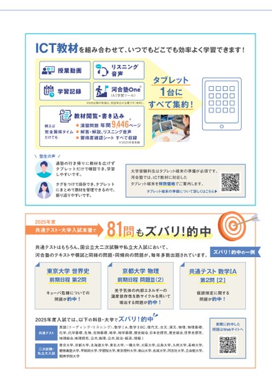 ICT教材を組み合わせて、いつでもどこでも効率よく学習できます!授業動画学習記録リスニング音声河合塾One※(A学習ツール)※6月以降の利用は、別途申込が必要です(有料)。タブレット1台にすべて集約!教材閲覧・書き込み●演習問題年間9,446ページ※●解答・解説、リスニング音声●習得度確認シートすべて収録※2025年度実績例えば完全習得タイムだけでも\塾生の声/通塾の行き帰りに教材を広げずタブレットだけで確認でき、学習しやすいです。タグをつけて保存でき、タブレットにまとめて教材を管理できるので、振り返りやすいです。大学受験科生はタブレット端末の準備が必須です。河合塾では、ICT教材に対応したタブレット端末を特別価格でご案内します。タブレット端末の準備について詳しくはこちら▶2025年度共通テスト・大学入試本番で81問もズバリ!的中共通テストはもちろん、国公立大二次試験や私立大入試において、河合塾のテキストや模試と同様の問題・同傾向の問題が、毎年多数出題されています。ズバリ!的中の一例東京大学世界史前期日程第2問キューバ危機についての問題が的中!京都大学物理前期日程問題Ⅲ(2)共通テスト数学ⅠA第2問[2]光子気体の内部エネルギーの温度依存性を熱サイクルを用いて導出する問題が的中!仮説検定に関する問題が的中!2025年度入試では、以下の科目・大学でズバリ!的中共通テスト英語(リーディング・リスニング)、数学ⅠA、数学ⅡBC、現代文、古文、漢文、物理、物理基礎、化学、化学基礎、生物、生物基礎、地学、地学基礎、歴史総合,日本史探究、歴史総合,世界史探究、地理総合,地理探究、公共,倫理、公共,政治・経済、情報Ⅰ二次試験・私立大入試東京大学、京都大学、北海道大学、東北大学、一橋大学、大阪大学、広島大学、九州大学、長崎大学、慶應義塾大学、早稲田大学、学習院大学、東京理科大学、南山大学、名城大学、同志社大学、立命館大学、関西学院大学実際に的中した問題はWebサイトへ