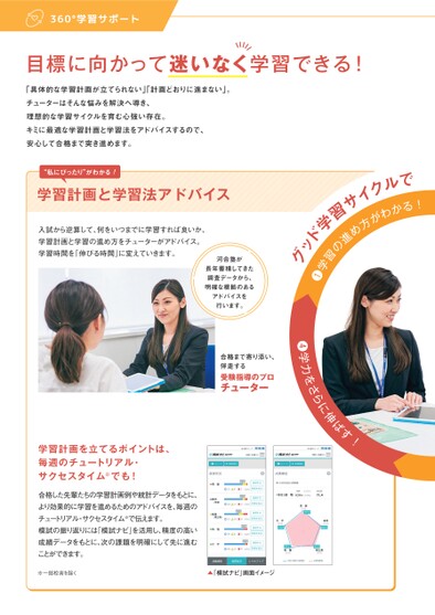 目標に向かって迷いなく学習できる!「具体的な学習計画が立てられない」「計画どおりに進まない」。チューターはそんな悩みを解決へ導き、理想的な学習サイクルを育む心強い存在。キミに最適な学習計画と学習法をアドバイスするので、安心して合格まで突き進めます。“私にぴったり”がわかる!学習計画と学習法アドバイス入試から逆算して、何をいつまでに学習すれば良いか、学習計画と学習の進め方をチューターがアドバイス。学習時間を「伸びる時間」に変えていきます。河合塾が長年蓄積してきた調査データから、明確な根拠のあるアドバイスを行います。ルでる!かわクがイ方サめ進習の習グッド学学❶す!に伸ばをさら❹学力合格まで寄り添い、伴走する受験指導のプロチューター学習計画を立てるポイントは、毎週のチュートリアル・サクセスタイム※でも!合格した先輩たちの学習計画例や統計データをもとに、より効果的に学習を進めるためのアドバイスを、毎週のチュートリアル・サクセスタイム※で伝えます。模試の振り返りには「模試ナビ」を活用し、精度の高い成績データをもとに、次の課題を明確にして先に進むことができます。※一部校舎を除く▲「模試ナビ」画面イメージ