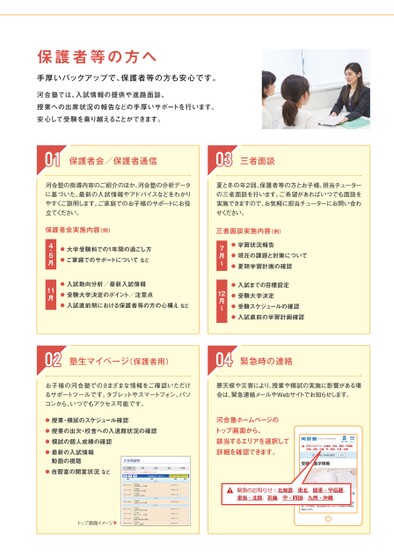 01保護者会/保護者通信03三者面談河合塾の指導内容のご紹介のほか、河合塾の分析データに基づいた、最新の入試情報やアドバイスなどをわかりやすくご説明します。ご家庭でのお子様のサポートにお役立てください。夏と冬の年2回、保護者等の方とお子様、担当チューターの三者面談を行います。ご希望があればいつでも面談を実施できますので、お気軽に担当チューターにお問い合わせください。●学習状況報告●現在の課題と対策について●夏期学習計画の確認7月〜三者面談実施内容(例)●入試までの目標設定●受験大学決定●受験スケジュールの確認●入試直前の学習計画確認12月〜●大学受験科での1年間の過ごし方●ご家庭でのサポートについてなど●入試動向分析/最新入試情報●受験大学決定のポイント/注意点●入試直前期における保護者等の方の心構えなど4・5月11月保護者会実施内容(例)02塾生マイページ(保護者用)04緊急時の連絡お子様の河合塾でのさまざまな情報をご確認いただけるサポートツールです。タブレットやスマートフォン、パソコンから、いつでもアクセス可能です。悪天候や災害により、授業や模試の実施に影響がある場合は、緊急連絡メールやWebサイトでお知らせします。●授業・模試のスケジュール確認●授業の出欠・校舎への入退館状況の確認●模試の個人成績の確認●最新の入試情報動画の視聴●自習室の開室状況など河合塾ホームページのトップ画面から、該当するエリアを選択して詳細を確認できます。トップ画面イメージ▲保護者等の方へ手厚いバックアップで、保護者等の方も安心です。河合塾では、入試情報の提供や進路面談、授業への出席状況の報告などの手厚いサポートを行います。安心して受験を乗り越えることができます。