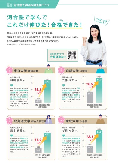 河合塾で学んでこれだけ伸びた!合格できた!圧倒的な得点&偏差値アップの実績を誇る河合塾。「昨年不合格だった大学に合格できた!」「昨年より偏差値が10上がった!」など、たくさんの塾生が成績を伸ばして合格を勝ち取っています。※掲載内容はすべてご本人の承諾を得ています。まだまだあります!合格体験談80757065市川高校出身緑川善久さん河合塾の授業では、どの講師も大学入学後を見据えた授業をしていたのが印象に残っています。受験はあくまで人生の通過点に過ぎないというのがよくわかりました。講師のおかげで飽きずに楽しく授業を受けられました。202477.314.8UP202362.5202469.0明和高校出身笠井涼太さん河合塾のテキストは、入試に直結した良問が多く、解説が詳しいため理解が深まります。また、基礎から応用まで体系的に学べる構成で、予習・復習もしやすかったです。7065605510.9UP202358.1第2回全統記述模試(総合偏差値)第2回全統記述模試(総合偏差値)京都大学法学部合格東京大学理科二類合格202465.7札幌西高校出身高木美優さん4月の段階から学習のペースを作って、ずっと継続して勉強し続けることが大切だと思います。Studyplusは、勉強時間が視覚化できてやる気がでるのでおすすめです。7065605511.9UP202353.8第3回全統記述模試(総合偏差値)仙台第二高校出身杉田知泰さん添削や質問、完全習得タイムを通じて合格に必要「記述力」を育むことがでなきたと考えています。特に二次試験前は毎日のように講師にアドバイスをもらい、徹底して支えてもらったおかげで、合格をつかめました。202467.67065605512.1UP202355.5第2回全統記述模試(総合偏差値)東北大学法学部合格北海道大学総合入試理系合格