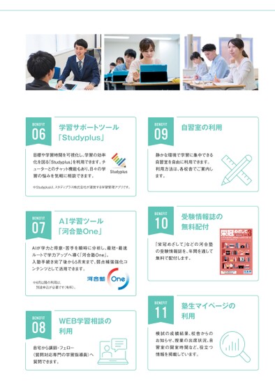 BENEFIT06学習サポートツール「Studyplus」BENEFIT09自習室の利用目標や学習時間を可視化し、学習の効率化を図る「Studyplus」を利用できます。チューターとのチャット機能もあり、日々の学習の悩みを気軽に相談できます。※Studyplusは、スタディプラス株式会社が運営する学習管理アプリです。静かな環境で学習に集中できる自習室を自由に利用できます。利用方法は、各校舎でご案内します。BENEFIT07AⅠ学習ツール「河合塾One」AIが学力と得意・苦手を瞬時に分析し、最短・最速ルートで学力アップへ導く「河合塾One」。入塾手続き完了後から5月末まで、弱点補強強化コンテンツとして活用できます。※6月以降の利用は、別途申込が必要です(有料)。BENEFIT08WEB学習相談の利用自宅から講師・フェロー(質問対応専門の学習指導員)へ質問できます。BENEFIT10受験情報誌の無料配付「栄冠めざして」などの河合塾の受験情報誌を、年間を通して無料で配付します。BENEFIT11塾生マイページの利用模試の成績結果、校舎からのお知らせ、授業の出席状況、自習室の開室時間など、役立つ情報を掲載しています。