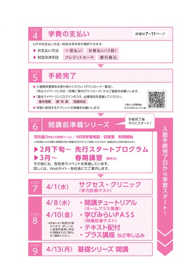STEP4学費の支払い詳細は7〜11ページ以下のお支払い方法・初回決済手段が選択できます。▶お支払い方法▶初回決済手段一括払いクレジットカード分割払い(2回)銀行振込入塾手続完了日から学習スタート!STEP5手続完了▶入塾関係書類をお受け取りください(ダウンロード・郵送)。「申込マイページ」内の、「各種ご案内ダウンロード」からご確認をお願いします。▶「塾生マイページ」にログインのうえ、必要項目を登録してください。基本情報顔写真受講科目▶学習に使用するタブレットの準備をお願いします。STEP6開講前準備シリーズ入塾から授業開始までの流れはこちら▶手続完了後すぐにスタート!河合塾One(AⅠ学習ツール)/WEB学習相談/自習室利用開始※河合塾Oneは学費入金確認の翌々営業日の正午からご利用いただけます(営業日は土日祝を除きます)。▶2月下旬〜先行スタートプログラム▶3月〜春期講習(要申込)その他にも、各校舎でイベントを実施しています。詳しくは、Webサイト・各校舎にてご案内します。STEP7STEP8STEP94/1(水)サクセス・クリニック(学力診断テスト)4/8(水)4/10(金)〜※校舎により実施日が異なります。詳しくは、入塾関係書類に同封のをご確認ください。「開講までのご案内」(ホームクラス発表)・開講チュートリアル・学びみらいPASS・テキスト配付・プラス講座など申し込み(特徴診断テスト)4/13(月)基礎シリーズ開講