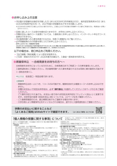 ●お申し込み上の注意入塾申込河合塾大学受験科は高校を卒業した方(または2026年3月卒業見込の方)、高卒認定取得済みの方(または2026年取得予定の方)で、2027年度大学受験をめざす方を対象とします。※2026年4月1日時点で25歳以上の方は入塾できません。25歳以上の方で河合塾大学受験科への入塾をご希望の方は、希望校舎へお問い合わせください。定員に達したコースは受付を締め切りますので、お早めにお申し込みください。学費お支払い後のコース変更については、入塾校舎にお申し出ください。インターネット申込でコース変更はできません。河合塾専用寮への入寮を希望される方は、別冊「入寮案内」をご覧ください。必ず保護者等の方の同意を得たうえでお申し込みください。【お申し込みのご本人・保護者等の皆様】2022年4月1日の民法改正で成年年齢が引き下げとなりましたが、弊塾[(株)河合塾進学研究社含む]では満18歳以上の方の入塾のお申し込みに際して、学費等をご負担いただく保護者等の方の同意を確認のうえ、お手続きいただきます。以下の場合は、窓口申込をご利用ください。「自己推薦」「高校推薦」により認定を取得する。ご兄弟・姉妹の方が2019〜2026年度河合塾生で、入塾金一部免除を利用する。●席確保申込〜合格発表をお待ちの方へ〜合格発表をお待ちになっている方のために、合格発表日までご希望コースの席を確保いたします。入塾希望校舎にご相談ください。河合塾専用寮への入寮を希望される方は同時に寮の確保も可能です(一部校舎を除く)。校舎窓口・特設会場で承ります。申込方法注意事項席確保申込はお一人につき、1コースのみ可能です。複数校舎または複数コースへのお申し込みはできません。学費のお支払いで初回決済手段は、必ず「銀行振込」を選択してください(18ページの⑤をご確認ください)。ご入塾を決定された後でも、お支払い前であれば初回決済手段を「クレジット支払い」に変更できます。決済手段の変更(初回お支払い前)については、22ページをご確認ください。ご入塾意思確認のため、振込期限日前でもご連絡する場合があります。大学合格により席確保申込をキャンセルされる場合は、速やかに入塾希望校舎にご連絡ください。学費のお支払いに関することなど「よくあるご質問」はWebサイトで確認できます。「よくあるご質問」はこちら▶「個人情報の保護に関する事項」について河合塾グループは、お客様が記入された個人情報を厳重に取り扱い、適正な個人情報の管理を実施します。ログインⅠDを登録する際に、Web画面上に表示される「個人情報の保護に関する事項」もよくお読みください。①利用目的・お申し込み手続き、および確認の連絡・個人を特定できない方法・形式による統計資料の作成、および各種アンケートなどによる資料作成協力の依頼・教材、時間割の送付など授業運営・学籍簿の作成や保護者会のご案内などの各種ご連絡ほかクラス運営(入塾の場合)・登録された情報と河合塾グループが主催するイベント・模擬試験などの参加履歴を結びつけ、河合塾グループからのお役に立つ各種情報を送付・配信するため。また、河合塾グループが提供する学習サービス、イベント、商品のご案内などの各種情報を、修了後も送付・配信することがあります。・河合塾グループの法人が運営する卒業後の進路選択に寄与するサービス等の案内送付のため②個人情報提供の任意性個人情報の提供は任意です。ただし、提出されない個人情報がある場合、上記①の利用目的に記載の諸手続きや処理、またサービス提供などに支障が生じる場合があります。あらかじめご了承ください。個人情報の訂正・削除を希望される場合は、その旨お申し出ください。速やかに必要な手続きをお取りいたします。③個人情報の訂正・削除④個人情報の共同利用「個人情報の取り扱いに関する契約」を取り交わした河合塾グループ内の法人(教育関連事業を営む学校法人と株式会社)が、河合塾グループからのご案内のため共同利用します。共同利用する法人の範囲は河合塾グループWebサイトをご覧ください。www.kawaijuku.jp/privacy/#about_shared⑤個人情報の取り扱いの委託個人情報の取り扱いの一部または全部を、河合塾グループ内の法人以外に委託する場合は、個人情報を適切に取り扱っていると認められる委託先を選定し、「個人情報の取り扱いに関する契約」を取り交わすとともに適正な管理および監督を行います。⑥ご自分以外の方の個人情報の提供お客様がご自分以外の方の個人情報を河合塾グループに提供される際には、必ずその方に、個人情報を提供すること、および提供される情報の利用目的についてご説明になり、その方の同意を得たうえで、ご提供ください。⑦個人情報管理責任者学校法人河合塾顧客情報管理部長⑧個人情報の取り扱いに関するお問い合わせ先学校法人河合塾顧客情報管理部住所:名古屋市千種区今池2-1-10E-mail:kokyaku@kawai-juku.ac.jp受付時間:12:0