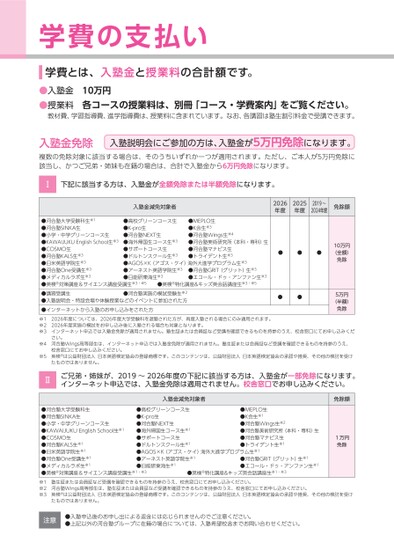 学費の支払い学費とは、入塾金と授業料の合計額です。●入塾金10万円●授業料各コースの授業料は、別冊「コース・学費案内」をご覧ください。教材費、学習指導費、進学指導費は、授業料に含まれています。なお、各講習は塾生割引料金で受講できます。入塾金免除入塾説明会にご参加の方は、入塾金が5万円免除になります。複数の免除対象に該当する場合は、そのうちいずれか一つが適用されます。ただし、ご本人が5万円免除に該当し、かつご兄弟・姉妹も在籍の場合は、合計で入塾金から6万円免除になります。Ⅰ下記に該当する方は、入塾金が全額免除または半額免除になります。入塾金減免対象者2026年度2025年度2019〜2024年度免除額●MEPLO生●K会生※3●河合塾Wins生※4●河合塾美術研究所(本科・専科)生●河合塾マナビス生●トライデント生※3●高校グリーンコース生●K-pro生●河合塾NEXT生●海外帰国生コース生※3●サポートコース生●ドルトンスクール生※3●AGOS×K(アゴス・ケイ)海外大進学プログラム生※3●アーネスト英語学院生※3●日能研東海生※3●河合塾大学受験科生※1●河合塾SINKA生●小学・中学グリーンコース生●KAWAIJUKUEnlishSchool生※3●COSMO生●河合塾KALS生※3●日米英語学院生※3●河合塾One受講生※3●メディカルラボ生※3●英検®対策講座&サイエンス講座受講生※3・※5●講習受講生●河合塾実施の模試受験生※2●入塾説明会・特設会場や体験授業などのイベントに参加された方●インターネットから入塾のお申し込みをされた方●河合塾GRIT(グリット)生※3●エコール・ドゥ・アンファン生※3●英検®特化講座&キッズ英会話講座生※3・※5●●●10万円(全額)免除●●5万円(半額)免除※12026年度については、2026年度大学受験科を退塾された方が、再度入塾される場合にのみ適用されます。※22026年度実施の模試をお申し込み後に入塾される場合も対象となります。※3インターネット申込では入塾金免除が適用されません。塾生証または会員証など受講を確認できるものを持参のうえ、校舎窓口にてお申し込みください。校舎窓口にてお申し込みください。たものではありません。※4河合塾Wins高等部生は、インターネット申込では入塾金免除が適用されません。塾生証または会員証など受講を確認できるものを持参のうえ、※5英検®は公益財団法人日本英語検定協会の登録商標です。このコンテンツは、公益財団法人日本英語検定協会の承認や推奨、その他の検討を受けⅡご兄弟・姉妹が、2019〜2026年度の下記に該当する方は、入塾金が一部免除になります。インターネット申込では、入塾金免除は適用されません。校舎窓口でお申し込みください。入塾金減免対象者●河合塾大学受験科生●河合塾SINKA生●小学・中学グリーンコース生●KAWAIJUKUEnlishSchool生※1●COSMO生●河合塾KALS生※1●日米英語学院生※1●河合塾One受講生※1●メディカルラボ生※1●英検®対策講座&サイエンス講座受講生※1・※3●高校グリーンコース生●K-pro生●河合塾NEXT生●海外帰国生コース生※1●サポートコース生●ドルトンスクール生※1●AGOS×K(アゴス・ケイ)海外大進学プログラム生※1●アーネスト英語学院生※1●日能研東海生※1●MEPLO生●K会生※1●河合塾Wins生※2●河合塾美術研究所(本科・専科)生●河合塾マナビス生●トライデント生※1●河合塾GRIT(グリット)生※1●エコール・ドゥ・アンファン生※1●英検®特化講座&キッズ英会話講座生※1・※3免除額1万円免除※1塾生証または会員証など受講を確認できるものを持参のうえ、校舎窓口にてお申し込みください。※2河合塾Wins高等部生は、塾生証または会員証など受講を確認できるものを持参のうえ、校舎窓口にてお申し込みください。※3英検®は公益財団法人日本英語検定協会の登録商標です。このコンテンツは、公益財団法人日本英語検定協会の承認や推奨、その他の検討を受けたものではありません。注意●入塾申込後のお申し出による返金には応じられませんのでご注意ください。●上記以外の河合塾グループに在籍の場合については、入塾希望校舎までお問い合わせください。