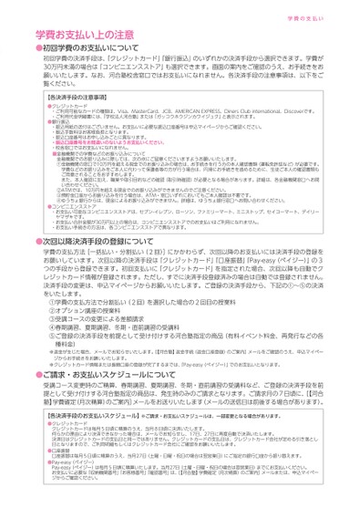 学費の支払い学費お支払い上の注意●初回学費のお支払いについて初回学費の決済手段は、「クレジットカード」「銀行振込」のいずれかの決済手段から選択できます。学費が30万円未満の場合は「コンビニエンスストア」も選択できます。画面の案内をご確認のうえ、お手続きをお願いいたします。なお、河合塾校舎窓口ではお支払いになれません。各決済手段の注意事項は、以下をご覧ください。【各決済手段の注意事項】●クレジットカード●銀行振込・ご利用可能なカードの種類は、Visa、MasterCard、JCB、AMERICANEXPRESS、DinersClubinternational、Discoverです。・ご利用代金明細書には、「学校法人河合塾」または「ガッコウホウジンカワイジュク」と表示されます。・振込用紙の送付はございません。お支払いに必要な振込口座番号は申込マイページからご確認ください。・振込手数料はお客様負担となります。・振込口座番号はお申し込みごとに異なります。・振込口座番号をお間違いのないようお支払いください。・校舎窓口ではお支払いになれません。■金融機関での学費などのお振り込みについて金融機関でのお振り込みに際しては、次の点にご留意くださいますようお願いいたします。①金融機関の窓口で10万円を超える現金でのお振り込みの場合は、お手続きを行う方の本人確認書類(運転免許証など)が必要です。学費などのお振り込みをご本人に代わって保護者等の方が行う場合は、円滑にお手続きを進めるために、生徒ご本人の確認書類もご用意されることをおすすめします。また、本人確認に加え、職業や取引目的などの確認(取引時確認)が必要となる場合があります。詳細は、各金融機関窓口へお問い合わせください。②ATMでは、10万円を超える現金でのお振り込みができませんのでご注意ください。③預貯金口座からお振り込みを行う場合は、ATM・窓口いずれにおいてもご本人確認は不要です。④ゆうちょ銀行からは、現金によるお振り込みができません。詳細は、ゆうちょ銀行窓口へお問い合わせください。・お支払い可能なコンビニエンスストアは、セブン-イレブン、ローソン、ファミリーマート、ミニストップ、セイコーマート、デイリー●コンビニエンスストアヤマザキです。・お支払い合計金額が30万円以上の場合は、コンビニエンスストアでのお支払いはご利用になれません。・お支払い手続きの方法は、各コンビニエンスストアで異なります。●次回以降決済手段の登録について学費の支払方法[一括払い・分割払い(2回)]にかかわらず、次回以降のお支払いには決済手段の登録をお願いしています。次回以降の決済手段は「クレジットカード」「口座振替」「Pay-easy(ペイジー)」の3つの手段から登録できます。初回支払いに「クレジットカード」を指定された場合、次回以降も自動でクレジットカード情報が登録されます。ただし、すでに決済手段登録済みの場合は自動では登録されません。決済手段の変更は、申込マイページからお願いいたします。ご登録の決済手段から、下記の①〜⑤の決済をいたします。①学費の支払方法で分割払い(2回)を選択した場合の2回目の授業料②オプション講座の授業料③受講コースの変更による差額請求④春期講習、夏期講習、冬期・直前講習の受講料⑤ご登録の決済手段を前提として受け付けする河合塾指定の商品(有料イベント料金、再発行などの各種料金)ジからお手続きをお願いいたします。※返金が生じた場合、メールでお知らせいたします。[【河合塾】返金手続(返金口座登録)のご案内]メールをご確認のうえ、申込マイペー※クレジットカード情報または振替口座の登録が完了するまでは、「Pay-easy(ペイジー)」でのお支払いとなります。●ご請求・お支払いスケジュールについて受講コース変更時のご精算、春期講習、夏期講習、冬期・直前講習の受講料など、ご登録の決済手段を前提として受け付けする河合塾指定の商品は、発生時のみのご請求となります。ご請求月の7日頃に、[【河合塾】学費確定(月次精算)のご案内]メールをお送りいたします(メールの送信日は前後する場合があります)。【各決済手段のお支払いスケジュール】※ご請求・お支払いスケジュールは、一部変更となる場合があります。●クレジットカード●口座振替●Pay-easy(ペイジー)クレジットカードは毎月5日頃に精算のうえ、当月8日頃に決済いたします。何らかの理由により決済できなかった場合は、メールでお知らせし、17日、27日に再度自動で決済いたします。決済日はクレジットカードの支払日と同一ではありません。クレジットカードの支払日は、クレジットカード会社が定める引き落とし日となりますので、ご利用明細もしくはクレジットカード会社にご確認をお願いいたします。口座振替は毎月5日頃に精算のうえ、当月27日(土曜・日曜・祝日の場合は翌営業日)にご指定の銀行口座から振り替えます。Pay-easy(ペイジー)は毎月5日頃に精算いたします。当月27日(土曜・日曜・祝日