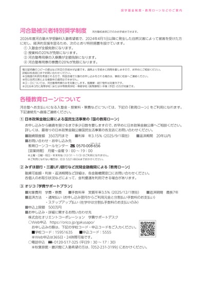 奨学基金制度・教育ローンなどのご案内河合塾被災者特別奨学制度河合塾校舎窓口でのみお手続きできます。2026年度河合塾大学受験科入塾希望者で、2024年4月1日以降に発生した自然災害によって被害を受けた方に対し、経済的支援を図るため、次のとおり特別措置を設けています。①入塾金が全額免除になります。②授業料の20%が免除になります。③河合塾専用寮の入寮費が全額免除になります。④河合塾専用寮の寮費の20%が免除になります。罹災証明書のコピーの提出など所定の手続きが必要です。通常より手続きに時間を要しますので、お早めにご相談ください。詳細は校舎窓口までお問い合わせください。※当制度の利用を希望される方で、特設会場で入塾のお申し込みをされる場合は、事前に校舎へご連絡ください。※同じ自然災害による複数年の適用はできません。※③・④については、河合塾専用寮のみを対象とします。推薦寮・紹介物件は対象外です。※2026年3月に高等学校(または中等教育学校・専修学校〈高等課程〉)卒業(予定)の方が対象です。各種教育ローンについて河合塾へお支払いになる入塾金・授業料・寮費などについては、下記の「教育ローン」をご利用になれます。下記連絡先へ直接ご連絡ください。日本政策金融公庫による国民生活事業の「国の教育ローン」お申し込みから融資を受けるまで多少日数を要しますので、お早めに日本政策金融公庫へご相談ください。詳しくは、最寄りの日本政策金融公庫国民生活事業の各支店にお問い合わせください。■融資限度額350万円まで■利率年3.15%(2025/9/1現在)■返済期間20年以内■お問い合わせ・お申し込み先教育ローンコールセンター[営業時間]月曜〜金曜9:00〜19:000570-008-656※土曜・日曜・祝日・年末年始(12/31〜1/3)はご利用になれません。※ご利用になれない場合は、(03)5321-8656までおかけください。みずほ銀行・三菱UFJ銀行など民間金融機関による「教育ローン」融資可能額・利率・返済期間など詳細は、各金融機関窓口にお問い合わせください。各個人のお取引状況などによって、金利優遇を利用できる場合があります。オリコ「学費サポートプラン」■対象費用学費・寮費■手数料率実質年率3.5%(2025/12/1現在)■返済期間最長7年■返済方法・通常払い(お申し込み翌月からご利用元金と分割払い手数料のお支払い)・ステップアップ払い(在学中は分割払手数料のお支払いのみ)■申込上限額500万円■お申し込み・詳細に関するお問い合わせ先株式会社オリエントコーポレーション学費サポートデスク○Web申込https://orico.jp/gakusapo/お申し込みの際は、下記の学校コード・申込コードをご入力ください。■学校コード:15951635■申込コード:5555※Web申込は365日・24時間可能です。○電話申込※秋葉原館・藤沢館に入塾希望の方は、「052-231-3199」におかけください。®0120-517-325(平日9:30〜17:30)