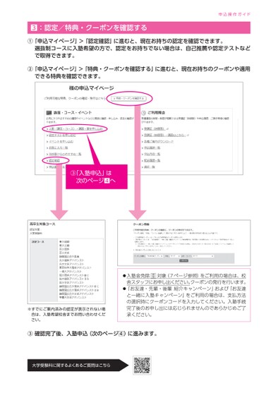 申込操作ガイド:認定/特典・クーポンを確認する①「申込マイページ」>「認定確認」に進むと、現在お持ちの認定を確認できます。選抜制コースに入塾希望の方で、認定をお持ちでない場合は、自己推薦や認定テストなどで取得できます。②「申込マイページ」>「特典・クーポンを確認する」に進むと、現在お持ちのクーポンや適用できる特典を確認できます。③「入塾申込」は次のページへ※すでにご案内済みの認定が表示されない場合は、入塾希望校舎までお問い合わせください。入塾金免除Ⅱ対象(7ページ参照)をご利用の場合は、校舎スタッフにお申し出ください。クーポンの発行を行います。「お友達・先輩・後輩紹介キャンペーン」および「お友達と一緒に入塾キャンペーン」をご利用の場合は、支払方法の選択時にクーポンコードを入力してください。入塾手続完了後のお申し出には応じられませんのであらかじめご了承ください。③確認完了後、入塾申込(次のページ)に進みます。大学受験科に関するよくあるご質問はこちら