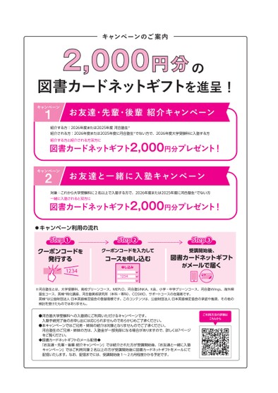 キャンペーンのご案内2,000円分の図書カードネットギフトを進呈!キャンペーン1お友達・先輩・後輩紹介キャンペーン紹介する方:2026年度または2025年度河合塾生※紹介される方:2026年度または2025年度に河合塾生※でない方で、2026年度大学受験科に入塾する方紹介する方と紹介される方双方に図書カードネットギフト2,000円分プレゼント!キャンペーン2お友達と一緒に入塾キャンペーン対象:これから大学受験科に2名以上で入塾する方で、2026年度または2025年度に河合塾生※でない方一緒に入塾されると双方に図書カードネットギフト2,000円分プレゼント!キャンペーン利用の流れStep❶クーポンコードを発行する1234Step❷クーポンコードを入力してコースを申し込む申し込み1234Step❸受講開始後、図書カードネットギフトがメールで届く※河合塾生とは、大学受験科、高校グリーンコース、MEPLO、河合塾SINKA、K会、小学・中学グリーンコース、河合塾Wins、海外帰国生コース、英検®特化講座、河合塾美術研究所(本科・専科)、COSMO、サポートコースの在籍者です。英検®は公益財団法人日本英語検定協会の登録商標です。このコンテンツは、公益財団法人日本英語検定協会の承認や推奨、その他の検討を受けたものではありません。●河合塾大学受験科への入塾時にご利用いただけるキャンペーンです。入塾手続完了後のお申し出には応じられませんのであらかじめご了承ください。●本キャンペーンではご兄弟・姉妹の紹介は対象となりませんのでご了承ください。河合塾生のご兄弟・姉妹の方は、入塾金が一部免除になる場合がありますので、詳しくは7ページをご覧ください。◆図書カードネットギフトのメール配信◆「お友達・先輩・後輩紹介キャンペーン」では紹介された方が受講開始後、「お友達と一緒に入塾キャンペーン」ではご利用対象2名以上の方が受講開始後に図書カードネットギフトをメールにて配信いたします。なお、配信までには、受講開始後1〜2カ月程度かかる予定です。ご利用方法の詳細はこちらから