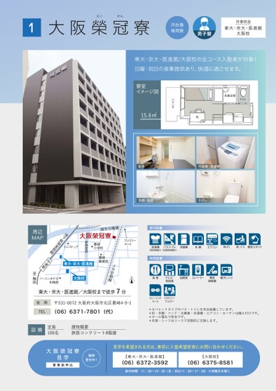 えい大阪榮冠寮かん河合塾専用寮男子寮東大・京大・医進館対象校舎大阪校東大・京大・医進館/大阪校の全コース入塾者が対象!日曜・祝日の食事提供あり、快適に過ごせます。洗面浴室洗面浴室トイレトイレ間取り図間取り図机机ベランダベランダ寮室イメージ図15.6㎡室内冷蔵庫・洗濯機洗面・浴室トイレ室内設備洗濯機バス・トイレ(簡易乾燥機能付)(浴室暖房乾燥機能付)冷蔵庫本棚エアコンWi-Fi机・イス電気スタンドファミリーマート城北公園通大阪榮冠寮豊崎小学校新御堂筋地下鉄御ミニストップ堂筋線周辺MAP東大・京大・医進館/大阪校まで徒歩7分住所TEL〒531-0072大阪府大阪市北区豊崎4-9-1(06)6371-7801(代)設備定員100名建物概要鉄筋コンクリート8階建トレーニングルームドミトリーフェロー*セパレートタイプのバス・トイレを完全装備しています。*机・本棚・ベッド・冷蔵庫・洗濯機・エアコン・カーテンは備え付けです。*オール電化で安全です。*布団・シーツはリースで定期的に交換します。共同設備N食堂テレビ・談話室自習室エレベーター電気掃除機電子レンジ豊崎郵便局JR京都線中津駅東大・京大・医進館大阪校ハートンホテル北梅田至梅田大阪榮冠寮見学要事前申込随時受付中!見学を希望される方は、事前に入塾希望校舎にお問い合わせください。【東大・京大・医進館】(06)6372-3592【大阪校】(06)6375-8581受付時間11:30〜19:30(日・祝は11:30〜17:00)※休館日を除く