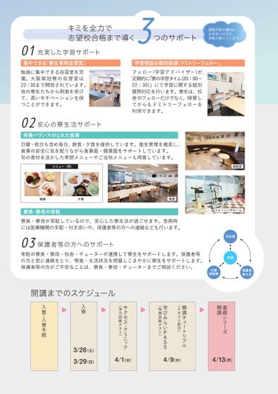 キミを全力で志望校合格まで導くつのサポート通塾可能な圏内にお住まいの方も、多数入寮しています。学習相談&個別指導「ドミトリーフェロー」フェロー(学習アドバイザー)が、定期的に「寮の学習タイム(20:00〜22:30)」にて学習に関する個別質問対応を行います。寮生は、校舎のフェローだけでなく、帰寮してからもドミトリーフェローを利用できます。メニュー(例)談話室朝食夕食食堂寮長・寮母の常駐寮長・寮母が常駐しているので、安心した寮生活が過ごせます。急病時には医療機関の手配・付き添いや、保護者等の方への連絡なども行います。保護者等の方へのサポート常駐の寮長・寮母・校舎・チューターが連携して寮生をサポートします。保護者等の方と密に連絡をとり、喫食・生活状況を把握しこまやかに寮生をサポートします。保護者等の方がご不安なことは、寮長・寮母・チューターまでご相談ください。トレーニングルーム河合塾生徒大阪榮冠寮保護者等の方基礎シリーズ開講開講チュートリアル(テキスト配付)学びみらいPASS(特徴診断テスト)サクセス・クリニック(学力診断テスト)4/1(水)4/9(木)4/13(月)入寮3/28(土)3/29(日)入塾・入寮手続開講までのスケジュール栄養バランスのとれた食事日曜・祝日も含め毎日、朝食・夕食を提供しています。衛生管理を徹底し、食事の安全に気を配りながら食事面・健康面をサポートしています。旬の食材を活かした季節メニューやご当地メニューも用意しています。充実した学習サポート集中できる「寮生専用自習室」勉強に集中できる自習室を完備。大阪榮冠寮の自習室は22:30まで開放されています。他の寮生たちから刺激を受けて、高いモチベーションを保つことができます。安心の寮生活サポート