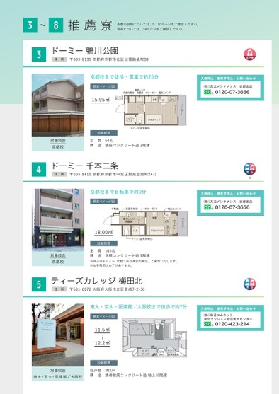 〜推薦寮各寮の設備については、9・10ページをご確認ください。費用については、14ページをご確認ください。ドーミー鴨川公園住所〒603-8135京都府京都市北区出雲路俵町36京都校まで徒歩・電車で約25分寮室イメージ図15.95㎡すのこベッド対象校舎京都校設備概要定員構造:64名:鉄筋コンクリート造3階建ドーミー千本二条住所〒604-8411京都府京都市中京区聚楽南町24-3京都校まで自転車で約9分寮室イメージ図18.00㎡設備概要すのこベッド対象校舎京都校:165名:鉄筋コンクリート造9階建定員構造※男子はドーミー京都二条が満室の場合、ご案内いたします。※女子専用フロアがあります。ティーズカレッジ梅田北住所〒531-0072大阪府大阪市北区豊崎7-2-30東大・京大・医進館/大阪校まで徒歩で約7分寮室イメージ図11.5㎡〜12.2㎡設備概要ベッドシューズボックスデスクチェアハンガー掛け2ドア冷凍冷蔵庫対象校舎東大・京大・医進館/大阪校総戸数構造:202戸:鉄骨鉄筋コンクリート造地上10階建女子寮入寮申込・寮見学申込・お問い合わせ(株)共立メンテナンス京都支店0120-07-3656男女※入寮申込・寮見学申込・お問い合わせ(株)共立メンテナンス京都支店0120-07-3656男女入寮申込・寮見学申込・お問い合わせ(株)毎日コムネット学生マンション総合案内センター0120-423-214
