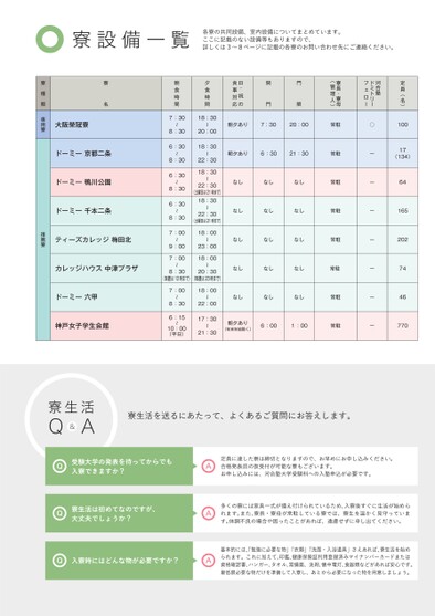 定員(名)10017(134)641652027446770○ーーーーーーー朝夕あり7:3020:00常駐朝夕あり6:3021:30常駐なしなしなし常駐なしなしなし常駐なしなしなし常駐なしなしなし常駐夕食時間18:30〜20:0018:30〜22:3018:30〜22:30(土曜日は21時まで)18:30〜22:30(土曜日は21時まで)18:00〜23:0018:00朝食時間7:30〜8:306:30〜8:306:30〜8:306:30〜8:307:00〜9:007:00〜8:30〜20:30(取置は12時まで)(取置は23時まで)7:00〜8:306:15〜10:00(平日)18:00〜22:0017:30〜21:30なしなしなし常駐朝夕あり(年末年始除く)6:001:00常駐河合塾ドミトリーフェロー寮長・寮母(管理人)開門門限祝日・食事対応の寮設備一覧各寮の共同設備、室内設備についてまとめています。ここに記載のない設備等もありますので、詳しくは3〜8ページに記載の各寮のお問い合わせ先にご連絡ください。寮名大阪榮冠寮ドーミー京都二条ドーミー鴨川公園ドーミー千本二条寮種類専用寮カレッジハウス中津プラザティーズカレッジ梅田北推薦寮ドーミー六甲神戸女子学生会館寮生活A&Q寮生活を送るにあたって、よくあるご質問にお答えします。Q受験大学の発表を待ってからでも入寮できますか?Q寮生活は初めてなのですが、大丈夫でしょうか?Q入寮時にはどんな物が必要ですか?AAA定員に達した寮は締切となりますので、お早めにお申し込みください。合格発表前の仮受付が可能な寮もございます。お申し込みには、河合塾大学受験科への入塾申込が必要です。多くの寮には家具一式が備え付けられているため、入寮後すぐに生活が始められます。また、寮長・寮母が常駐している寮では、寮生を温かく見守っています。体調不良の場合や困ったことがあれば、遠慮せずに申し出てください。基本的には、勉強に必要な物」「衣類」「洗面・入浴道具」さえあれば、寮生活を始められます。これに加えて、印鑑、健康保険証利用登録済みマイナンバーカードまたは資格確認書、ハンガー、タオル、常備薬、洗剤、懐中電灯、食器類などがあれば安心です。最低限必要な物だけを準備して入寮し、あとから必要になった物を用意しましょう。