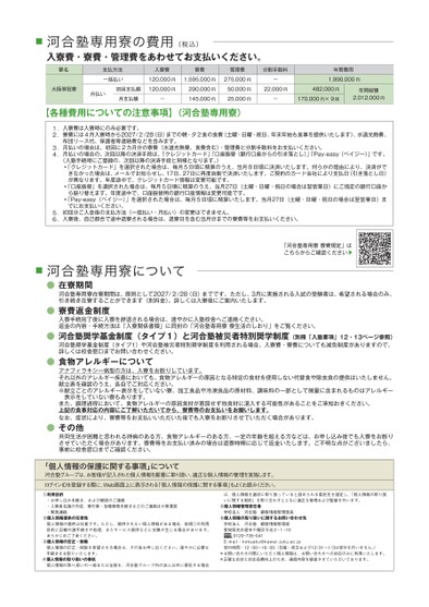 ■河合塾専用寮の費用(税込)入寮費・寮費・管理費をあわせてお支払いください。寮名大阪榮冠寮支払方法一括払い月払い初回支払額月支払額入寮費120,000円120,000円-寮費管理費分割手数料1,595,000円290,000円145,000円275,000円50,000円25,000円-22,000円-482,000円170,000円×9回年間総額2,012,000円年間費用1,990,000円【各種費用についての注意事項】(河合塾専用寮)1.2.3.4.5.6.入寮費は入寮時にのみ必要です。寮費には4月入寮時から2027/2/28(日)までの朝・夕2食の食費(土曜・日曜・祝日、年末年始も食事を提供いたします)、水道光熱費、布団リース代、保護者等連絡費などを含みます。月払いの場合は、初回に2カ月分の寮費(水道光熱費、食費含む)・管理費と分割手数料をお支払いください。月払いの場合の、次回以降の決済手段は、「クレジットカード」「口座振替(銀行口座からの引き落とし)」「Pay-easy(ペイジー)」です。(入塾手続時にご登録の、次回以降の決済手段と同様となります。)「クレジットカード」を選択された場合は、毎月5日頃に精算のうえ、当月8日頃に決済いたします。何らかの理由により、決済ができなかった場合は、メールでお知らせし、17日、27日に再度自動で決済いたします。ご契約のカード会社により支払日(引き落とし日)が異なります。年度途中で、クレジットカード情報は変更可能です。「口座振替」を選択された場合は、毎月5日頃に精算のうえ、当月27日(土曜・日曜・祝日の場合は翌営業日)にご指定の銀行口座から振り替えます。年度途中で、口座振替用の銀行口座情報は変更可能です。「Pay-easy(ペイジー)」を選択された場合は、毎月5日頃に精算いたします。当月27日(土曜・日曜・祝日の場合は翌営業日)までにお支払いください。初回分ご入金後の支払方法(一括払い・月払い)の変更はできません。入寮後、自己都合で途中退寮される場合は、退寮日を含む当月分までの寮費等をお支払いください。「河合塾専用寮寮費規定」はこちらからご確認ください▼■河合塾専用寮について●在寮期間●寮費返金制度河合塾専用寮在寮期間は、原則として2027/2/28(日)までです。ただし、3月に実施される入試の受験者は、希望される場合のみ、引き続き在寮することができます(別料金)。詳しくは入寮後にご案内いたします。入寮手続完了後に入寮を辞退される場合は、速やかに入塾校舎へご連絡ください。返金の内容・手続方法は「入寮関係書類」に同封の「河合塾専用寮寮生活のしおり」をご覧ください。●河合塾奨学基金制度(タイプ1)と河合塾被災者特別奨学制度(別冊「入塾要項」12・13ページ参照)河合塾奨学基金制度(タイプ1)や河合塾被災者特別奨学制度を利用される場合、入寮費・寮費についても減免制度がありますので、詳しくは校舎窓口までお問い合わせください。●食物アレルギーについてアナフィラキシー病型の方は、入寮をお断りしています。それ以外のアレルギー疾患においても、食物アレルギーの原因となる特定の食材を使用しない代替食や除去食の提供はいたしません。献立表を確認のうえ、各自でご対応ください。※献立ごとのアレルギー表示をしていない寮、加工食品や冷凍食品の原材料、調味料の一部として微量に含まれるものはアレルギー表示をしていない寮もあります。また、調理過程において、食物アレルギーの原因食材が意図せず他食材に混入する可能性があることをご承知おきください。上記の食事対応の内容にご了解いただいてから、寮費等のお支払いをお願いします。なお、症状により、寮費等をお支払いいただいた後でも入寮をお断りさせていただく場合があります。●その他共同生活が困難と思われる持病のある方、食物アレルギーのある方、一定の年齢を超える方などは、お申し込み後でも入寮をお断りさせていただく場合があります。寮費等をお支払い済みの場合は退寮時期に応じて返金いたします。ご不明な点がございましたら、事前に校舎窓口までご確認ください。「個人情報の保護に関する事項」について河合塾グループは、お客様が記入された個人情報を厳重に取り扱い、適正な個人情報の管理を実施します。ログインIDを登録する際に、Web画面上に表示される「個人情報の保護に関する事項」もよくお読みください。①利用目的・お申し込み手続き、および確認のご連絡・入寮者名簿の作成、寮行事・各種事務手続きなどのご連絡ほか寮運営・緊急連絡②個人情報提供の任意性個人情報の提供は任意です。ただし、提供されない個人情報がある場合、前項①の利用目的に記載の諸手続きや処理、またサービス提供などに支障が生じる場合があります。あらかじめご了承ください。③個人情報の訂正・削除④個人情報の取り扱いの委託個人情報の訂正・削除を希望される場合は、その旨お申し出ください。速やかに必要な手続きをお取りいたします。個人情報の取り扱いの一部または全部を、河合塾グループ内の法人以外に委託する場合は、個人情報を適切に取り扱っている
