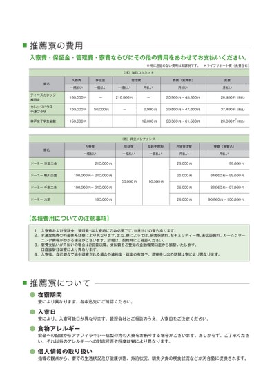 ■推薦寮の費用入寮費・保証金・管理費・寮費ならびにその他の費用をあわせてお支払いください。※特に注記のない費用は非課税です。*ライフサポート費(食費含む)入寮費一括払い保証金一括払い(株)毎日コムネット管理費一括払い月払い寮費(食費別)月払い食費月払い150,000円ー210,000円ー30,900円〜45,300円26,400円(税込)9,900円29,800円〜47,800円37,400円(税込)税込)*(20,000円12,000円38,500円〜61,500円ーー150,000円50,000円寮名ティーズカレッジ梅田北カレッジハウス中津プラザ神戸女子学生会館150,000円ー寮名入寮費一括払いドーミー京都二条210,000円(株)共立メンテナンス保証金一括払い契約手数料一括払い月間管理費月払い25,000円寮費(食費込)月払い99,660円ドーミー鴨川公園190,000円〜210,000円25,000円84,660円〜99,660円ドーミー千本二条190,000円〜210,000円25,000円82,960円〜97,960円50,000円16,500円ドーミー六甲190,000円26,000円90,860円〜100,860円【各種費用についての注意事項】1.入寮費および保証金、管理費※は入寮時にのみ必要です。※月払いの寮もあります。2.水道光熱費の料金体系は寮により異なります。また、寮によっては、損害保険料、セキュリティー費、通信設備料、ルームクリーニング費等がかかる場合がございます。詳細は、契約時にご確認ください。3.寮費支払いが月払いの場合は2回目以降、支払額をご登録の金融機関口座から振替いたします。口座振替日は寮により異なります。4.入寮後、自己都合で途中退寮される場合の違約金・返金の有無や、退寮申し出の期限は寮により異なります。■推薦寮について●在寮期間寮により異なります。各申込先にご確認ください。●入寮日寮により、入寮可能日が異なります。管理会社とご相談のうえ、入寮日をご決定ください。●食物アレルギー安全への配慮からアナフィラキシー病型の方の入寮をお断りする場合がございます。あしからず、ご了承ください。それ以外のアレルギーへの対応可否や程度は寮により異なります。●個人情報の取り扱い指導の観点から、寮での生活状況及び健康状態、外泊状況、朝食夕食の喫食状況などが河合塾に提供されます。
