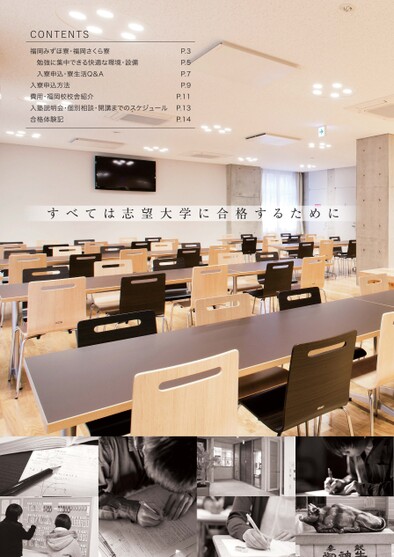 CONTENTS福岡みずほ寮・福岡さくら寮勉強に集中できる快適な環境・設備入寮申込・寮生活Q&A入寮申込方法費用・福岡校校舎紹介入塾説明会・個別相談・開講までのスケジュール合格体験記P.3P.5P.7P.9P.11P.13P.14すべては志望大学に合格するために