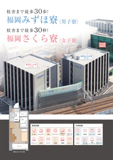 校舎まで徒歩30歩!福岡みずほ寮〈男子寮〉校舎まで徒歩30秒!福岡さくら寮〈女子寮〉河合塾福岡校福岡さくら寮(女子寮)福岡みずほ寮(男子寮)個室設備共用設備机・椅子デスクライト本棚クローゼット収納付きベッドウォシュレット付きトイレ食堂自習室エレベーター自販機バスルーム洗面台エアコン冷蔵庫洗濯機バルコニーWi-Fiコインコピー機玄関オートロック防犯カメラトイレ洗濯機冷蔵庫浴室バルコニー部屋の広さ:約5.3畳