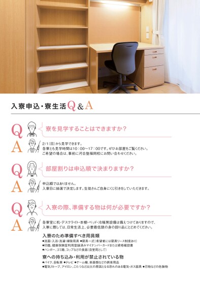 寮を見学することはできますか?2/1(日)から見学できます。各寮とも見学時間は10:00〜17:00です。ぜひお部屋をご覧ください。ご希望の場合は、事前に河合塾福岡校にお問い合わせください。部屋割りは申込順で決まりますか?申込順ではありません。入寮日に抽選で決定します。生徒さんご自身にくじ引きをしていただきます。入寮の際、準備する物は何が必要ですか?各寮室に机・デスクライト・本棚・ベッド・冷暖房設備は備えつけてありますので、入寮に際しては、日常生活上、必要最低限の身の回り品にとどめてください。入寮のため準備すべき用具類●洗面・入浴・洗濯・掃除用具●寝具一式(希望者には寝具リース制度あり)●印鑑、健康保険証利用登録済みマイナンバーカードまたは資格確認書●ハンガー、ゴミ箱、コップなどの食器(自室用として)寮への持ち込み・利用が禁止されている物●バイク、自転車●テレビ●ゲーム機、楽器類などの娯楽用品●電気ストーブ、アイロン、こたつなど出火の原因となる恐れのある電気・ガス器具●刃物などの危険物QAQAQA入寮申込・寮生活Q&A