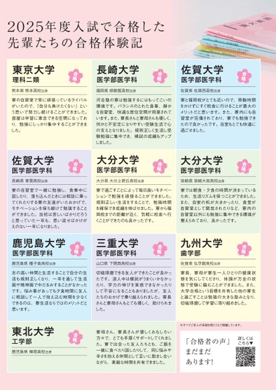 合格佐賀大学医学部医学科佐賀県佐賀西高校出身寮と福岡校がとても近いので、移動時間をかけずにすぐ校舎に行けることが最大のメリットだと思います。また、寮内にも自習室が完備されており、寮でも勉強できたので良かったです。自室もとても快適に過ごせました。合格長崎大学医学部医学科福岡県修館高校出身合格東京大学理科二類熊本県熊本高校出身寮の自習室で常に頑張っているライバルがいたので、「自分も負けたくない」という思いで努力し続けることができました。部屋は学習に専念できる空間になっており、勉強にしっかり集中することができました。河合塾の寮は勉強するにはもってこいの環境です。バランスのとれた食事、静かな自習室、快適な居住空間が用意されています。また、寮長さんと寮母さんも優しく、何かと不安定になりやすい受験生活で心の支えとなりました。規則正しく生活し受験勉強に集中でき、模試の成績もアップしました。合格大分大学医学部医学科宮崎県宮崎大宮高校出身合格大分大学医学部医学科大分県大分上野丘高校出身寮で過ごすことによって毎日高いモチベーションで勉強を頑張ることができました。規則正しい生活をすることで、勉強時間を確保でき成績を伸ばせました。寮から福岡校までの距離が近く、気軽に校舎へ行くことができたのも良かったです。寮では朝食・夕食の時間が決まっているため、生活リズムを保つことができました。また、自室の机が大きかったり、食堂が自習室として開放されたりなど、寮内の自習室以外にも勉強に集中できる環境が整えられており、良かったです。合格佐賀大学医学部医学科長崎県青雲高校出身寮の自習室で一緒に勉強し、食事中に話したり、落ち込んだときには相談に乗ってくれたりする寮の友達がいたおかげで、モチベーションを保ち続けて勉強することができました。当初は苦しいばかりだろうと思っていた一年も、思い返せばかけがえのない一年になりました。合格九州大学歯学部佐賀県弘学館高校出身合格三重大学医学部医学科山口県下関西高校出身合格鹿児島大学医学部医学科鹿児島県種子島高校出身志の高い仲間と生活することで自分の生活も規則正しくなり、一年を通して生活面や精神面で中だるみすることがなかったです。悩み事があっても夕食時間に友人に相談して一人で抱え込む時間を少なくできるのは、寮生活ならではのメリットだと思います。切磋琢磨できる友人ができたことが良かったです。浪人中は模試がうまくいかなかったり、学力の伸びを実感できなかったりして不安になることもありましたが、友人たちのおかげで乗り越えられました。寮長さんと寮母さんもとても優しく、助けられました。寮長、寮母が寮生一人ひとりの健康状態を気にしてくださり、体調が万全の状態で受験に臨むことができました。また、大学合格という目標を共有した他の寮生と過ごすことは勉強の大きな励みとなり、切磋琢磨して学習に取り組めました。寮母さん、寮長さんが優しくおもしろい方々で、とても手厚くサポートしてくれました。寮で出会った友人たちとも、ご飯を一緒に食べたり話したりして、同じ悩みや辛さを抱える仲間として互いに励まし合いながら、素敵な時間を共有できました。※すべてご本人の承諾を得たうえで掲載しています。詳しくはこちら▼「合格者の声」まだまだあります!合格東北大学工学部鹿児島県樟南高校出身2025年度入試で合格した先輩たちの合格体験記