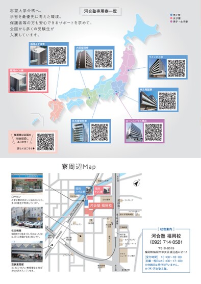 志望大学合格へ。学習を最優先に考えた環境。保護者等の方も安心できるサポートを求めて、全国から多くの受験生が入寮しています。河合塾専用寮一覧福岡みずほ寮大阪榮冠寮男子寮女子寮男子・女子寮ウインズ上杉東京飛躍寮名古屋啓発寮ローレルハウス横浜福岡さくら寮推薦寮は全国の校舎近辺にあります!詳しくはこちら▼ローソンみずほ寮の向かいにあるコンビニ。多くの塾生が利用しています。佐田病院福岡校から徒歩1分。何かあったときは、近くに病院があると安心です。Nミニストップ至天神渡辺通りファミリーマート桜十字福岡病院地下鉄七隈線広瀬病院地下鉄渡辺通駅セブンイレブンファミリーマートホテルニューオータニ博多鉄神天西イン福岡みずほ寮福岡さくら寮TOPPAN神大牟田線西鉄天福岡VBii河合塾福岡校ローソン渡辺通二丁目電気ビルセブンイレブン〒郵便局西鉄薬院駅地下鉄薬院駅セブンイレブン寮周辺Map六本松至薬院駅前[校舎案内]河合塾福岡校(092)7140581〒810-8619福岡県福岡市中央区渡辺通4-2-11[受付時間]10:00〜18:00(日曜・祝日は10:00〜17:00)※休館日は受付を行いません。※(学)河合塾主催。至博多駅至大橋福岡東映ホテル西鉄薬院駅コンビニ・カフェ・美容室などさまざまなお店が入っています。