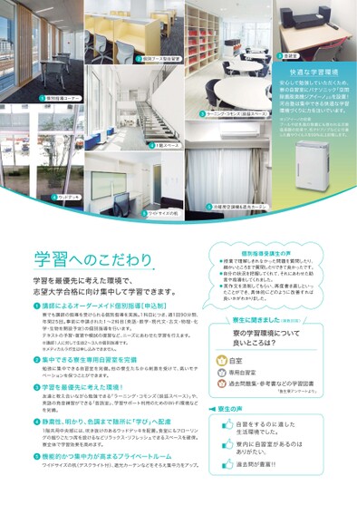1個別指導コーナー2個別ブース型自習室41階スペース3音読室快適な学習環境安心して勉強していただくため、寮の自習室にパナソニック「空間除菌脱臭機ジアイーノ」※を設置!河合塾は集中できる快適な学習環境づくりに力を注いでいます。※ジアイーノの効果プールやほ乳瓶の除菌にも使われる次亜塩素酸の効果で、机やドアノブなどに付着した菌やウイルスを99%以上抑制します。3ラーニング・コモンズ(談話スペース)4ウッドデッキ5ワイドサイズの机5冷暖房空調機&遮光カーテン学習へのこだわり学習を最優先に考えた環境で、志望大学合格に向け集中して学習できます。●講師によるオーダーメイド個別指導[申込制]1寮でも講師の指導を受けられる個別指導を実施。1科目につき、週1回90分間、年間25回。事前に申請された1〜2科目(英語・数学・現代文・古文・物理・化学・生物を開設予定)の個別指導を行います。テキストの予習・復習や模試の復習など、ニーズにあわせた学習を行えます。※講師1人に対して生徒2〜3人の個別指導です。※メディカルラボ生は申し込みできません。●集中できる寮生専用自習室を完備2勉強に集中できる自習室を完備。他の寮生たちから刺激を受けて、高いモチベーションを保つことができます。●学習を最優先に考えた環境!3友達と教え合いながら勉強できる「ラーニング・コモンズ(談話スペース)」や、英語の発音練習ができる「音読室」、学習サポート利用のためのWi-Fi環境などを完備。●静粛性、明かり、色調まで随所に「学び」へ配慮41階共用中央部には、吹き抜けのあるウッドデッキを配置。食堂にもフローリングの掘りごたつ席を設けるなどリラックス・リフレッシュできるスペースを確保。寮全体で学習効果を高めます。●機能的かつ集中力が高まるプライベートルーム5ワイドサイズの机(デスクライト付)、遮光カーテンなどをそろえ集中力をアップ。個別指導受講生の声授業で理解しきれなかった問題を質問したり、細かいところまで質問したりできて良かったです。自分の状況を把握してくれて、それにあわせた助言や指導をしてくれました。英作文を添削してもらい、再度書き直しといったことができ、具体的にどのように改善すれば良いかがわかりました。(複数回答)寮生に聞きました寮の学習環境について良いところは?123自室専用自習室過去問題集・参考書などの学習図書「塾生寮アンケートより」寮生の声自習をするのに適した生活環境でした。寮内に自習室があるのはありがたい。過去問が豊富!!