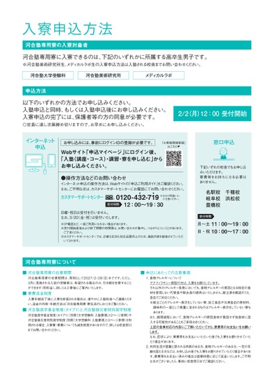 入寮申込方法河合塾専用寮の入寮対象者河合塾専用寮に入寮できるのは、下記のいずれかに所属する高卒生男子です。※河合塾美術研究所生、メディカルラボ生の入寮申込方法は入塾される校舎までお問い合わせください。河合塾大学受験科河合塾美術研究所メディカルラボ申込方法以下のいずれかの方法でお申し込みください。入塾申込と同時、もしくは入塾申込後にお申し込みください。入寮申込の完了には、保護者等の方の同意が必要です。◎定員に達し次第締め切りますので、お早めにお申し込みください。2/2(月)12:00受付開始インターネット申込お申し込みには、事前にログインIDの登録が必要です。「お客様情報登録」はこちら▼窓口申込Webサイト「申込マイページ」にログイン後、「入塾(講座・コース)・講習・寮を申し込む」からお申し込みください。●操作方法などのお問い合わせインターネット申込の操作方法は、Webサイトの「申込ご利用ガイド」をご確認ください。なお、ご不明な点は、カスタマーサポートセンターにお電話にてお問い合わせください。カスタマーサポートセンターⓇ受付時間日曜・祝日は受付を行いません。なお、3/20(金・祝)は受付いたします。・0120-432-719・12:00〜19:30※おかけ間違いにご注意ください。※ⅠP電話など、一部ご利用になれない場合があります。※受付開始直後および終了間際の時間帯は、お問い合わせが集中し、つながりにくいことがあります。ご了承ください。※カスタマーサポートセンターでは、正確な応対と対応品質向上のため、通話内容を録音させていただいております。下記いずれの校舎でもお申し込みいただけます。寮費等をお持ちになる必要はありません。名駅校千種校岐阜校浜松校豊橋校受付時間月〜土11:00〜19:00日・祝10:00〜17:00河合塾専用寮について■河合塾専用寮の在寮期間河合塾専用寮の在寮期間は、原則として2027/2/28(日)までです。ただし、3月に実施される入試の受験者は、希望される場合のみ、引き続き在寮することができます(別料金)。詳しくは入寮後にご案内いたします。■寮費返金制度入寮手続完了後に入寮を辞退される場合は、速やかに入塾校舎へご連絡ください。返金の内容・手続方法は「河合塾専用寮寮生活のしおり」をご覧ください。■河合塾奨学基金制度(タイプ1)と河合塾被災者特別奨学制度河合塾奨学基金制度(タイプ1)別冊「大学受験科入塾要項」12ページ参照)や河合塾被災者特別奨学制度(別冊「大学受験科入塾要項」13ページ参照)を利用される場合、入寮費・寮費についても減免制度がありますので、詳しくは校舎窓口までお問い合わせください。■申込にあたっての注意事項1.食物アレルギーについてアナフィラキシー病型の方は、入寮をお断りしています。それ以外のアレルギー疾患においても、食物アレルギーの原因となる特定の食材を使用しない代替食や除去食の提供はいたしません。献立表を確認のうえ、各自でご対応ください。※献立ごとのアレルギー表示をしていない寮、加工食品や冷凍食品の原材料、調味料の一部として微量に含まれるものはアレルギー表示をしていない寮もあります。また、調理過程において、食物アレルギーの原因食材が意図せず他食材に混入する可能性があることをご承知おきください。上記の食事対応の内容にご了解いただいてから、寮費等のお支払いをお願いします。なお、症状により、寮費等をお支払いいただいた後でも入寮をお断りさせていただく場合があります。2.共同生活が困難と思われる持病のある方、食物アレルギーのある方、一定の年齢を超える方などは、お申し込み後でも入寮をお断りさせていただく場合があります。寮費等をお支払い済みの場合は退寮時期に応じて返金いたします。ご不明な点がございましたら、事前に校舎窓口までご確認ください。