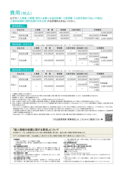 費用(税込)以下の①入寮費②寮費(室料+食費+水道光熱費)③管理費④分割手数料(月払いの場合)⑤個別指導料(個別指導付き申込者)の合計額をお支払いください。個別指導なし支払方法一括払い月払い初回支払額月支払額入寮費120,000円120,000円ー寮費1,485,000円270,000円135,000円管理費440,000円80,000円40,000円分割手数料22,000円ーー年間費用492,000円175,000円×9回2,045,000円年間総額2,067,000円個別指導1科目付き※月払いの場合、個別指導料は初回支払い後、8月・1月・2月以外毎月お支払いいただきます。支払方法一括払い初回支払額入寮費寮費120,000円1,485,000円270,000円120,000円管理費440,000円80,000円分割手数料ー22,000円月払い月支払額ー135,000円40,000円ー個別指導料1科目400,000円100,000円※50,000円ー年間費用2,445,000円年間総額2,467,000円592,000円225,000円×6回175,000円×3回個別指導2科目付き※月払いの場合、個別指導料は初回支払い後、8月・1月・2月以外毎月お支払いいただきます。支払方法一括払い初回支払額入寮費寮費120,000円1,485,000円270,000円120,000円管理費440,000円80,000円分割手数料ー22,000円月払い月支払額ー135,000円40,000円ー個別指導料2科目800,000円200,000円※100,000円ー年間費用2,845,000円年間総額2,867,000円692,000円275,000円×6回175,000円×3回1.2.3.4.5.6.入寮費は入寮時にのみ必要です。寮費には4月入寮時から2027/2/28日)までの朝・夕2食の食費(土曜・日曜・祝日・年末年始も食事を提供いたします)、水道光熱費などを含みます。管理費には、布団リース費、諸雑費を含みます。初回分ご入金後の支払い方法(一括払い・月払い)の変更はできませんのでご了承ください。月払いの場合は、初回に2カ月分の寮費(水道光熱費、食費含む)・管理費・個別指導料(個別指導を申し込んだ場合)と分割手数料をお支払いください。月払いの場合の、次回以降の決済手段は、クレジットカード」口座振替(銀行口座からの引き落とし)」Pay-easyペイジー)」です(入塾手続時にご登録の、次回以降の決済手段と同様となります)。・「クレジットカード」を選択された場合は、毎月5日頃に精算のうえ、当月8日頃に決済いたします。何らかの理由により決済できなかった場合は、メールでお知らせし、17日、27日に再度自動で決済いたします。ご契約のカード会社により支払日(引き落とし日)が異なります。年度途中で、クレジットカード情報は変更可能です。・「口座振替」を選択された場合は、毎月5日頃に精算のうえ、当月27日(土曜・日曜・祝日の場合は翌営業日)にご指定の銀行口座から振り替えます。年度途中で、口座振替用の銀行口座情報は変更可能です。・「Pay-easyペイジー)」を選択された場合は、毎月5日頃に精算いたします。当月27日(土曜・日曜・祝日の場合は翌営業日)までにお支払いください。「河合塾専用寮寮費規定」は、こちらからご確認ください▼「個人情報の保護に関する事項」について河合塾グループは、お客様が記入された個人情報を厳重に取り扱い、適正な個人情報の管理を実施します。ログインIDを登録する際に、Web画面上に表示される「個人情報の保護に関する事項」もよくお読みください。①利用目的・お申し込み手続き、および確認のご連絡・入寮者名簿の作成、寮行事・各種事務手続きなどのご連絡ほか寮運営・緊急連絡②個人情報提供の任意性し、「個人情報の取り扱いに関する契約」を取り交わすとともに適正な管理および監督を行います。⑤個人情報管理責任者学校法人河合塾顧客情報管理部長⑥個人情報の取り扱いに関するお問い合わせ先個人情報の提供は任意です。ただし、提供されない個人情報がある場合、前項①の利用目的に記載の諸手続きや処理、またサービス提供などに支障が生じる場合があります。あらかじめご了承ください。③個人情報の訂正・削除個人情報の訂正・削除を希望される場合は、その旨お申し出ください。速やかに必要な手続きをお取りいたします。④個人情報の取り扱いの委託学校法人河合塾顧客情報管理部愛知県名古屋市千種区今池21100120735041E-mail:kokyaku@kawai-juku.ac.jp受付時間:12:00〜18:00(日曜・祝日および12/31〜1/3は受付を行いません。)*お問い合わせの際にいただく個人情報は、お問い合わせへの対応のみに利用個人情報の取り扱いの一部または全部を、河合塾グループ内の法人以外に委託する場合は、個人情報を適切に取り扱っていると認められる委託先を選定いたします。*正確な応対と対応品質向上のため、通話内容を録音させていただいております。