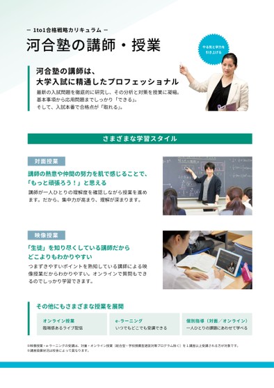 -�to�合格戦略カリキュラム-河合塾の講師・授業河合塾の講師は、大学入試に精通したプロフェッショナル最新の入試問題を徹底的に研究し、その分析と対策を授業に凝縮。基本事項から応用問題までしっかり「できる」。そして、入試本番で合格点が「取れる」。やる気と学力を引き上げるさまざまな学習スタイル対面授業講師の熱意や仲間の努力を肌で感じることで、「もっと頑張ろう!」と思える講師が一人ひとりの理解度を確認しながら授業を進めます。だから、集中力が高まり、理解が深まります。映像授業「生徒」を知り尽くしている講師だからどこよりもわかりやすいつまずきやすいポイントを熟知している講師による映像授業だからわかりやすい。オンラインで質問もできるのでしっかり学習できます。その他にもさまざまな授業を展開オンライン授業臨場感あるライブ配信e-ラーニングいつでもどこでも受講できる個別指導(対面/オンライン)一人ひとりの課題にあわせて学べる※映像授業・e-ラーニングの受講は、対面・オンライン授業(総合型・学校推薦型選抜対策プログラム除く)を1講座以上受講される方が対象です。※講座設置状況は校舎によって異なります。