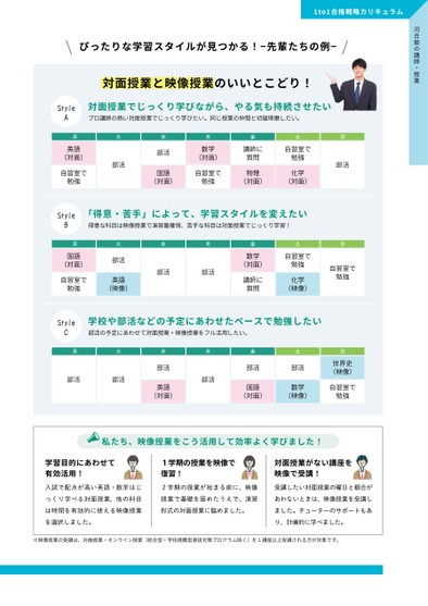 河合塾の講師・授業ぴったりな学習スタイルが見つかる!-先輩たちの例-�to�合格戦略カリキュラム対面授業と映像授業のいいとこどり!対面授業でじっくり学びながら、やる気も持続させたいプロ講師の熱い対面授業でじっくり学びたい。同じ授業の仲間と切磋琢磨したい。土勉強化学金講師に質問物理(対面)自習室で水部活国語自習室で木数学部活火(対面)(対面)(対面)勉強StyleA月英語(対面)自習室で勉強StyleB「得意・苦手」によって、学習スタイルを変えたい得意な科目は映像授業で演習量確保、苦手な科目は対面授業でじっくり学習!月国語(対面)自習室で勉強火部活英語(映像)水部活木部活金数学(対面)講師に質問自習室で土勉強化学(映像)日部活日自習室で勉強学校や部活などの予定にあわせたペースで勉強したいStyleC月部活火部活の予定にあわせて対面授業・映像授業をフル活用したい。金部活国語水部活英語部活部活木(対面)(対面)土部活数学(映像)日世界史(映像)自習室で勉強私たち、映像授業をこう活用して効率よく学びました!学習目的にあわせて有効活用!1学期の授業を映像で復習!対面授業がない講座を映像で受講!入試で配点が高い英語・数学はじ2学期の授業が始まる前に、映像受講したい対面授業の曜日と都合がっくり学べる対面授業、他の科目授業で基礎を固めたうえで、演習あわないときは、映像授業を受講しは時間を有効的に使える映像授業形式の対面授業に臨めました。ました。チューターのサポートもあを選択しました。り、計画的に学べました。※映像授業の受講は、対面授業・オンライン授業(総合型・学校推薦型選抜対策プログラム除く)を1講座以上受講される方が対象です。