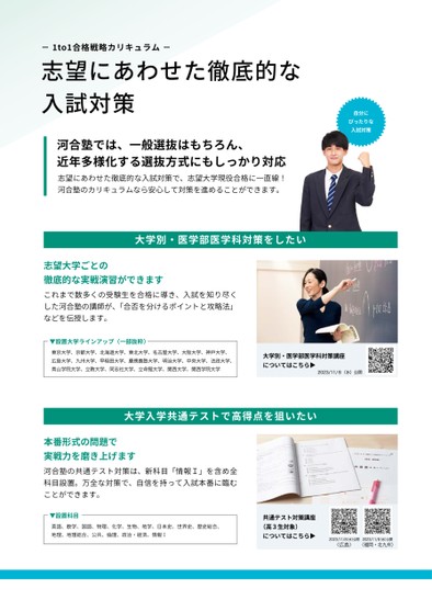 -�to�合格戦略カリキュラム-志望にあわせた徹底的な入試対策河合塾では、一般選抜はもちろん、近年多様化する選抜方式にもしっかり対応志望にあわせた徹底的な入試対策で、志望大学現役合格に一直線!河合塾のカリキュラムなら安心して対策を進めることができます。自分にぴったりな入試対策大学別・医学部医学科対策をしたい共通テスト対策講座(高3生対象)についてはこちら▶2023/11/8(水)公開〈福岡・北九州〉〈広島〉2023/11/8(水)公開志望大学ごとの徹底的な実戦演習ができますこれまで数多くの受験生を合格に導き、入試を知り尽くした河合塾の講師が、「合否を分けるポイントと攻略法」などを伝授します。▼設置大学ラインアップ(一部抜粋)東京大学、京都大学、北海道大学、東北大学、名古屋大学、大阪大学、神戸大学、広島大学、九州大学、早稲田大学、慶應義塾大学、明治大学、中央大学、法政大学、青山学院大学、立教大学、同志社大学、立命館大学、関西大学、関西学院大学本番形式の問題で実戦力を磨き上げます河合塾の共通テスト対策は、新科目「情報I」を含め全科目設置。万全な対策で、自信を持って入試本番に臨むことができます。▼設置科目英語、数学、国語、物理、化学、生物、地学、日本史、世界史、歴史総合、地理、地理総合、公共、倫理、政治・経済、情報Ⅰ大学別・医学部医学科対策講座についてはこちら▶2023/11/8(水)公開大学入学共通テストで高得点を狙いたい