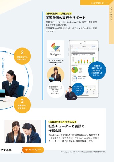 ���°学習サポートグッド学習サイクルが見える!“私の頑張り”学習計画の実行をサポート学習サポートツール「Studyplus」※で、学習計画や学習したことを手軽に登録。学習状況が一目瞭然だから、バランスよく効率的に学習できます。科目別の学習バランスがわかるから、計画の見直しもしやすい!2023年11月チューターのアドバイスでやる気もアップ!チューターがタイムリーに学習状況をチェック▶面談で課題にしていた英語を頑張ってるね!国語の演習ももう少し増やしてみよう!計画どおりに学習できる!結果をみて改善する!グッド学習サイクルで志望大学現役合格!を考える!“私のこれから”担当チューターと面談で作戦会議「Studyplus」※で記録した日々の学習状況と、模試やテストの結果から「できたこと・できなかったこと」を担当チューターと一緒に振り返り、課題を解決します。グで連携チューター※「Studyplus」は、スタディプラス株式会社が運営する学習管理アプリです。