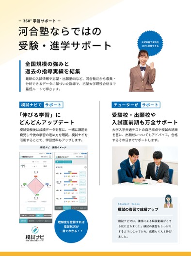 -���°学習サポート-河合塾ならではの受験・進学サポート全国規模の強みと過去の指導実績を結集最新の入試情報や志望・出願動向など、河合塾だから収集・分析できるデータに基づいた指導で、志望大学現役合格まで最短ルートで導きます。入試本番で実力を���%発揮できる模試ナビでサポート「伸びる学習」にどんどんアップデート模試受験後は成績データを基に、一緒に課題を発見し今後の学習の進め方を確認。模試ナビを活用することで、学習効率もアップします。模試ナビ画面イメージ河合太郎さん河合太郎さん成績自己採点偏差値マイページ第3回全統記述●総合1(国理)点/点62.064.4化学(65.0)英語(60.0)57.770.3物理(65.0)55.4数学(65.0)今回の模試の偏差値目標偏差値復習状況●英語●数学(Ⅲ型)●物理●化学?16/36問復習する16614/36問答案を見る9/19問復習する937/19問答案を見る23/30問復習する2316/30問答案を見る35/47問復習する35012/47問答案を見る個人成績表を見る成績確認復習状況レベルアップ復習リスト成績一覧自己分析成績グラフ志望校別評価成績確認復習状況レベルアップ復習リスト理解度を登録すれば一目でわかる!!復習状況がサポートチューターが受験校・出願校や入試直前期も万全サポート大学入学共通テストの自己採点や模試の結果を基に、出願校についてもアドバイス。合格するその日までサポートします。StudentVoice模試の復習で成績アップ模試ナビでは、講師による解説動画がとても役に立ちました。模試の復習をしっかりするようになってから、成績もぐんと伸びました。