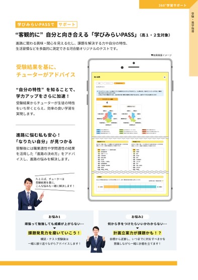 受験・進学指導���°学習サポート▼結果画面イメージ学びみらいPASSで“客観的に”サポート自分と向き合える「学びみらいPASS」(高1・2生対象)進路に関わる興味・関心を見える化し、課題を解決する力や自分の特性、生活習慣などを多面的に測定できる河合塾オリジナルのテストです。個人結果概要リテラシーコンピテンシーコンピテンシーコンピテンシーとは、人と自分にベストな状態をもたらそうとする力のこと。人と関わる力、自分をコントロールする力、課題に向かう力の3つにわけられています。どれも3つの力で構成されており、自分を取り巻く環境に実践的に対処するためには、全部で9つの力が必要になります。今回のレベル前回のレベル協働力統率力親和力12345親和力実践力協働力計画立案力12345実践力計画立案力課題発見力統率力課題発見力行動持続力感情制御力行動持続力感情制御力自信創出力自信創出力コンピテンシー総合4親和力協働力統率力仲間と信頼関係を築く力協力的に課題に取り組む力議論を建設的に進めていく力感情制御力自分の気持ちをコントロールする力課題発見力解決する課題を発見する力自信創出力自分に自信を持ち向上させようとする力計画立案力解決のために効果的に計画を立てる力行動持続力最後まで粘り強く責任を持って取り組む力実践力解決のために自ら行動する力職業適性TOP20学問適性TOP20あなたの「興味・関心」から職業に対する適合度が高かったTOP20を記載しています。詳細は「職業適性」から確認できます。あなたの「興味・関心」から学問に対する適合度が高かったTOP20を記載しています。詳細は「学問適性」から確認できます。1位2位3位4位5位6位7位8位9位10位11位空港業務スタッフ(搭乗受付業務)臨床検査技師証券アナリスト半導体設計国家公務員政治家司法書士・行政書士国際機関職員作業管理・保守管理獣医師起業家・経営者文理傾向1位2位3位4位5位6位7位8位9位10位11位宗教学地理学数学考古学薬学応用物理学土木工学医学栄養・食物学応用化学物理学あなたの学問適合度の高かったTOP20の学問について、文系・理系度の割合を集計し表示しています。各学問の文系・理系度の割合?文系的理系的受験結果を基に、チューターがアドバイス“自分の特性”を知ることで、学力アップをさらに加速!受験結果からチューターが生徒の特性をいち早くとらえ、効率の良い学習を実現します。進路に悩む私も安心!「なりたい自分」が見つかる受験後には職業適性や学問適性の結果を活用した「進路の決め方」をアドバイスし、進路の悩みを解決します。たとえば、チューターは受験結果を基に、こんな悩みも一緒に解決します!お悩み�頑張って勉強しても成績が上がらない…課題発見力を磨いていこう!模試・テスト受験後はお悩み�何から手をつけたらいいかわからない…計画立案力が課題かも!?目標から逆算し、いつまでに何をすべきかを一緒に振り返りながらアドバイスします!意識しながら一緒に計画を立てます!