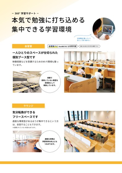 -���°学習サポート-本気で勉強に打ち込める集中できる学習環境学習環境が整っていて安心して取り組める!自習室ナビ(Web事前予約)も利用可能*校舎に来る前に空き状況を確認できる!自習室一人ひとりのスペースが仕切られた個別ブース型です映像授業などを受講するためのWi-Fi環境も整っています。授業で使用していない教室を自習室として開放しています。ラウンジ気分転換ができるフリースペースです適度な環境音があるほうが集中できるという方は、自習することもできます。※設置されていない校舎もあります。適度な休憩は学習効率の向上にもつながります。