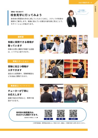 学習環境ぜひお気軽にお越しください!���°学習サポート百聞は一見に如かず!校舎見学に行ってみよう各校舎の雰囲気を存分に感じていただくために、スタッフが校舎の施設をご案内します。勉強に励んでいる塾生の姿を直に見ることで、モチベーションが高まります。講師室気軽に質問できる環境が整っています授業の合間に講師が待機する部屋は、いつでも入室できます。情報ステーション受験に役立つ情報が入手できます過去の入試問題や、受験情報誌などを自由に閲覧できます。教務窓口(チュータールーム)チューターが丁寧にお応えします進路や毎日の学習など、質問や相談ができます。各校舎の施設案内は、Webからも確認できます。施設案内の情報はこちら▶広島福岡北九州*利用可能施設、使用用途は校舎によって異なります。詳細は、ご希望の校舎へお問い合わせください。