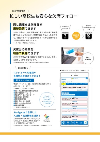 -���°学習サポート-忙しい高校生も安心な欠席フォロー同じ講座を違う曜日で振替受講できます欠席する場合は、同じ講座を違う曜日や他校舎で振替受講することができます。振替受講できなかった場合でも、「塾生マイページ(塾生専用サイト)」から授業で扱った問題の解答を確認できます。※一部、対象外の講座や校舎があります。欠席分の授業を映像で視聴できます自宅で河合塾の授業を映像※で視聴できるため、欠席した分もしっかり学習できます。※映像授業の講師は、対面で受講している講師とは原則異なります。やむを得ない理由で欠席違う曜日や他校舎の同じ講座で受講7(火)振替受講制度10(金)自宅で映像視聴▶「塾生マイページ」ログイン後のトップ画面イメージMy塾生マイページ高校グリーンコース予定学習実績目標面談KJ通信毎日頑張れていますね!学習計画も一緒に登録してみよう!WEBTeacherはこちら2024年09月今日前週翌週今月のスケジュールをチェック14(木)17:40〜18:40授業●●校601高3早大漢文第02講欠席・振替申請19:00〜20:30授業●●校601高3早大古文第02講欠席・振替申請15(金)17:00〜19:40授業●●校402高3早大現代文第03講欠席・振替申請16(土)18:00〜20:40授業●●校402高3早慶大世界史第03講欠席・振替申請お知らせ予約・申込欠席・振替自習室のお知らせStudyplusWEBTeacher塾生も保護者もスケジュールの確認や各種申込手続きもできる!塾生マイページ「塾生マイページ」は、塾生・保護者の皆様と河合塾をつなぐ大切なサポートツールです。*保護者用サイトもご用意しています。●校舎への入退館情報や授業の出欠状況●授業や模試のスケジュール●英語音声データのダウンロード※●授業の欠席・振替申請※●自習室の開室時間●模試・テストゼミの成績※●模試・イベントの申し込み●授業の解答閲覧※※一部対象外の講座があります。タブレットやスマートフォンパソコンからいつでもどこでもアクセス可能Studyplusで登録した入退館・出席情報も連携!入退館や授業の出席登録も「Studyplus」※を利用します。登録した情報は、塾生マイページで確認することができます。※「Studyplus」は、スタディプラス株式会社が運営する学習管理アプリです。