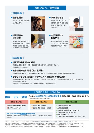 [利用特典]▶自習室利用個別ブース型の自習室などが使えます。▶対面講座の映像視聴受講する対面講座は、欠席時や復習用として映像で視聴(無料)できます。※一部対象外の講座があります。合格に近づく塾生特典▶WEB学習相談自宅から講師・フェロー(質問対応専門の学習指導員)に質問ができます。※事前予約制▶進学情報誌の無料配付進学情報満載の「栄冠めざして」など河合塾の情報誌を無料で配付します。[料金特典]▶講習塾生割引料金の適用在籍中の春期、夏期、冬期・直前講習を塾生割引料金で受講できます。※直前講習は高3生対象です。在籍中の直前講習を、1講座無料で受講できます(一部の講座を除く/在籍地区設置講座のみ)。▶直前講習の無料受講(高3生対象)▶ケンブリッジ英語検定・リンガスキル塾生割引料金の適用河合塾が実施するケンブリッジ英語検定、「リンガスキル(ケンブリッジ英語検定4技能CBT)」を塾生割引料金で受検できます。※ケンブリッジ英語検定を受検する方は、対策講座(映像授業)を無料で受講できます。さらに塾生をサポートする仕組み河合塾が����年1月~��月に実施する下記の模試・テストを受験できます。※受験回数は、入塾申込の時期によって異なります。模試・テスト受験高1生(最大4回)●全統高1模試(第1回~第3回)●高1プライムステージ高2生(最大4回)●全統高1模試(第4回)●全統高2模試(第1回~第3回)高3生(最大��回)●全統共通テスト高2模試●全統記述高2模試●全統共通テスト模試(第1回~第3回)●全統記述模試(第1回~第3回)●全統プレ共通テスト●その他の模試(国立大入試オープンなど:4回分)学びみらいPASS受験職業や学問の適性などを診断する河合塾オリジナルのテスト「学びみらいPASS」を受験できます。(年度中1回)高1・2生※塾生として各模試・テストの申し込みができるのは各模試実施日の��日前までに学費のお支払いを完了し、学籍番号が発番された方が対象です。※塾生の方が在籍高校において受験料を支払って記載の模試・テストを受験された場合には受験料を返金いたします。返金方法については、別途ご案内します。※各模試・テストには申込期間がありますのでご注意ください。入塾申込の時期によっては、塾生としてご利用になれない場合があります。※テスト費用(模試・テスト等)は、塾生サポート料に含まれます。対象模試・テスト以外、上限回数を超え受験する場合は、別途受験費用をお支払いください。