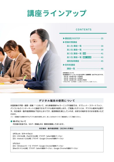 講座ラインアップCONTENTS▶講座選びのSTEP…………………………��▶受験対策講座………………………��高1生講座一覧高2生講座一覧………………………��高3生講座一覧広島…………………��…………��高3生講座一覧福岡・北九州個別指導講座…………………………��▶目的別講座講座一覧………………………………��【学年表示について】河合塾高校グリーンコースにおける学年(在籍期間)は以下のとおりです。●高1生:����年4月~��月末日●高2生:����年1月~��月末日●高3生:����年1月~����年3月末日※学校の学年(在学期間)とは異なりますのでご注意ください。デジタル端末の使用について対面授業の予習・復習・授業(*)において、また映像授業やe-ラーニングの講座では、タブレット・スマートフォン、パソコンなどインターネットに接続できるデジタル端末を使用します。ご受講いただくには、デジタル端末が必要です。対応端末・動作推奨環境は下記のとおりです。推奨環境を満たしていれば、お持ちの端末をそのまま使用いただけます。(*)一部講座では授業の中でもデジタル端末を使用します。詳しくはWebサイトの「講座案内」にてご確認ください。●Wi-Fiについて河合塾の校舎では、Wi-Fi(無線LAN)環境を整備しております。対応端末・動作推奨環境(2023年8月現在)〈タブレット/スマートフォン〉【OS:iOS16以降、iPadOS16以降】ブラウザ:Safariの最新バージョン【OS:Android12.0以降】ブラウザ:GoogleChromeの最新バージョン〈パソコン〉【OS:Windows10・11】ブラウザ:GoogleChromeの最新バージョン【MacOSX12.4以降】ブラウザ:Safariの最新バージョン、GoogleChromeの最新バージョン