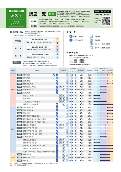 ※受講の目安偏差値は、河合塾全統模試における偏差値数字が大きいほど難度が高く、入試難易度の高い大学をめざす方向けの講座です。認定制「認定制」講座の受講には認定が必要です。マークのない講座はどなたでも受講できます。※オンライン授業(個別)を受講の場合、認定は必要ありません。講座一覧受験対策講座(映像/オンライン〈総合型・学校推薦型選抜対策プログラム〉)のみのお申し込みはできません。受験対策講座(対面/オンライン〈総合型・学校推薦型選抜対策プログラムを除く〉)と組み合わせて、お申し込みください。下記に記載の授業時間に休憩時間は含みません。※150分授業には途中休憩があります。※一部講座を除く。授業日程は別冊「2024年度高校グリーンコース入塾要項」をご確認ください。※スタート学期:1〜3月/1学期:4〜7月/2学期:9〜12月スタート学期:9講、1学期:13講、2学期:13講〈年間35講〉授業講数授業時間●講座レベル●マーク:採点・添削あり:リスニングあり:映像授業:対面授業:オンライン授業(個別)2023/11/8(水)公開講座を探す・申し込むWebサイトへアクセス!特別選抜目標大学:東大・京大・医学部医学科受講の目安偏差値65.0〜56難関目標大学:難関国公立大・早慶大など受講の目安偏差値55.0〜34標準目標大学:国公立大・私立大受講の目安偏差値〜55.012●開講学期講座によって開講時期が異なります。ス:スタート学期(1月開講)1:1学期(4月開講)2:2学期(9月開講)※映像授業は開講学期以降受講可能です。高3生2024年1月スタート受験対策講座:オンライン授業(集団)講座レベル難関標準1234特別選抜56教科名講座名認定制東大英語認定制京大英語認定制医進英語認定制特別選抜英語認定制難関国公立大英語認定制早慶大英語※1認定制広大英語英語国公立大英語私大英語入試頻出英文法・語法共通テスト対策英語認定制東大理類数学認定制京大理系数学認定制医進数学認定制特別選抜理系数学ⅢC認定制特別選抜数学ⅠAⅡBC-理系-認定制特別選抜数学ⅠAⅡBC-文系-認定制難関理系数学ⅢC認定制難関数学ⅠAⅡBC認定制難関数学ⅠAⅡBC-理系-認定制難関数学ⅠAⅡBC-文系-認定制広大理系数学数学標準理系数学ⅢC標準数学ⅠAⅡBC共通テスト対策数学ⅠAⅡBC共通テスト対策数学ⅠA共通テスト対策数学C「平面上の曲線と複素数平面」国語認定制難関現代文認定制難関古典※1※2認定制難関古文※1学期によって授業分数が異なります(スタート学期:90分、1・2学期:150分)。※2スタート学期は古文のみです。授業形式開講学期ス12授業時間年間講数●●●●●●●●●●●●●●●●●●●●●●●●●●●●●●●●●●●●●●●●●●●●●●●●●●●●●●●●●●●●●●●●●●●●●●●●●●●●●●●●●●●●●150分150分150分150分90分90分/150分90分90分90分90分90分150分150分150分150分90分90分90分90分90分90分90分90分90分90分90分90分90分90分/150分90分35講35講35講35講35講35講35講35講35講22講26講35講35講35講35講35講35講35講35講35講35講35講35講35講26講12講4講35講35講35講