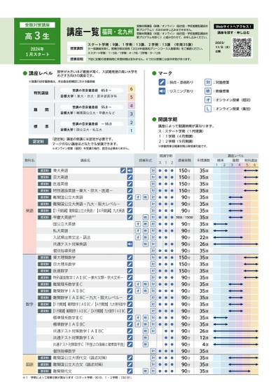 ※受講の目安偏差値は、河合塾全統模試における偏差値認定制「認定制」講座の受講には認定が必要です。マークのない講座はどなたでも受講できます。※オンライン授業(個別)を受講の場合、認定は必要ありません。講座一覧受験対策講座(映像/オンライン〈総合型・学校推薦型選抜対策プログラム〉)のみのお申し込みはできません。受験対策講座(対面/オンライン〈総合型・学校推薦型選抜対策プログラムを除く〉)と組み合わせて、お申し込みください。下記に記載の授業時間に休憩時間は含みません。※150分授業には途中休憩があります。※一部講座を除く。授業日程は別冊「2024年度高校グリーンコース入塾要項」をご確認ください。※スタート学期:1〜3月/1学期:4〜7月/2学期:9〜12月スタート学期:9講、1学期:13講、2学期:13講〈年間35講〉授業講数授業時間●講座レベル●マーク:採点・添削あり:リスニングあり:映像授業:対面授業:オンライン授業(個別)2023/11/8(水)公開講座を探す・申し込むWebサイトへアクセス!特別選抜目標大学:東大・京大・医学部医学科受講の目安偏差値65.0〜56難関目標大学:難関国公立大・早慶大など受講の目安偏差値55.0〜34標準目標大学:国公立大・私立大受講の目安偏差値〜55.012●開講学期講座によって開講時期が異なります。ス:スタート学期(1月開講)1:1学期(4月開講)2:2学期(9月開講)※映像授業は開講学期以降受講可能です。高3生2024年1月スタート受験対策講座数字が大きいほど難度が高く、入試難易度の高い大学をめざす方向けの講座です。:オンライン授業(集団)講座レベル難関標準1234特別選抜56教科名講座名授業形式開講学期ス12授業時間年間講数認定制東大英語認定制京大英語認定制医進英語認定制特別選抜英語-東大・京大・医進-認定制難関国公立大英語認定制難関国公立大英語-九大・阪大レベル-認定制【1月開講】難関国公立大英語/【4月開講】九大英語認定制早慶大英語※1国公立大英語私大英語入試頻出英文法・語法共通テスト対策英語個別指導英語認定制東大理類数学認定制京大理系数学認定制医進数学認定制認定制難関理系数学ⅢC認定制難関数学ⅠAⅡBC認定制難関数学ⅠAⅡBC-九大・阪大レベル-認定制【1月開講】難関数学ⅠAⅡBC/【4月開講】九大理系数学認定制【1月開講】難関数学ⅠAⅡBC/【4月開講】九大数学ⅠAⅡBC特別選抜数学ⅠAⅡBC-東大文類・京大文系-英語数学標準理系数学ⅢC標準数学ⅠAⅡBC共通テスト対策数学ⅠAⅡBC共通テスト対策数学ⅠA共通テスト対策数学C「平面上の曲線と複素数平面」個別指導数学国語認定制難関国公立大現代文(論述対策)認定制難関国公立大古文(論述対策)認定制難関現代文※1学期によって授業分数が異なります(スタート学期:90分、1・2学期:150分)。●●●●●●●●●●●●●●●●●●●●●●●●●●●●●●●●●●●●●●●●●●●●●●●●●●●●●●●●●●●●●●●●●●●●●●●●●●●●●●●●●●●●●●●●150分150分150分150分90分90分90分90分/150分90分90分90分90分90分150分150分150分90分90分90分90分90分90分90分90分90分90分90分90分90分90分90分35講35講35講35講35講35講35講35講35講35講22講26講35講35講35講35講35講35講35講35講35講35講35講35講26講12講4講35講35講35講35講