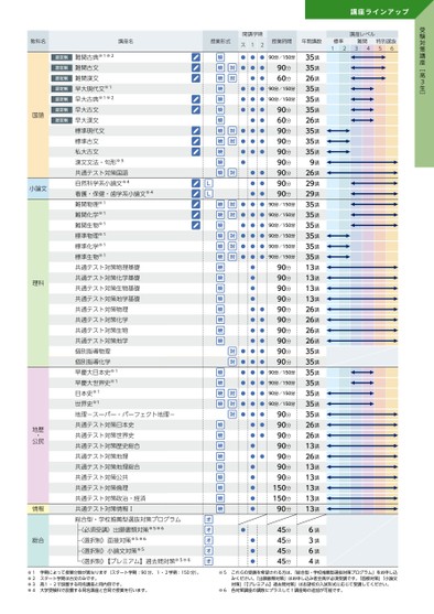 受験対策講座﹇高3生﹈講座ラインアップ講座レベル難関標準1234特別選抜56教科名講座名授業形式開講学期ス12授業時間年間講数認定制難関古典※1※2認定制難関古文認定制難関漢文認定制早大現代文※1認定制早大古典※1※2認定制早大古文認定制早大漢文標準現代文標準古文私大古文漢文文法・句形※3共通テスト対策国語自然科学系小論文※4看護・保健・歯学系小論文※4難関物理※1難関化学※1難関生物※1標準物理※1標準化学※1標準生物※1共通テスト対策物理基礎共通テスト対策化学基礎共通テスト対策生物基礎共通テスト対策地学基礎共通テスト対策物理共通テスト対策化学共通テスト対策生物共通テスト対策地学個別指導物理個別指導化学早慶大日本史※1早慶大世界史※1日本史※1世界史※1地理-スーパー・パーフェクト地理-共通テスト対策日本史共通テスト対策世界史共通テスト対策歴史総合共通テスト対策地理共通テスト対策地理総合共通テスト対策公共共通テスト対策倫理共通テスト対策政治・経済共通テスト対策情報Ⅰ総合型・学校推薦型選抜対策プログラム〈必須受講〉出願書類対策※5※6〈選択制〉面接対策※5※6〈選択制〉小論文対策※5〈選択制〉【プレミアム】過去問対策※5※6国語小論文理科地歴公民・情報総合●●●●●●●●●●●●●●●●●●●●●●●●●●●●●●●●●●●●●●●●●●●●●●●●●●●●●●●●●●●●●●●●●●●●●●●●●●●●●●●●●●●●●●●●●●●●●●●●●●●●●●90分/150分90分60分90分/150分90分/150分90分60分90分90分90分90分90分90分90分90分/150分90分/150分90分/150分90分/150分90分/150分90分/150分90分90分90分90分90分90分90分90分90分90分90分/150分90分/150分90分/150分90分/150分90分90分90分90分90分90分90分150分150分90分45分45分45分45分35講35講26講35講35講35講26講35講35講35講9講26講29講29講35講35講35講35講35講35講13講13講13講13講26講26講26講26講35講35講35講35講35講35講35講26講26講13講26講13講13講13講13講13講6講3講6講4講※1学期によって授業分数が異なります(スタート学期:90分、1・2学期:150分)。※2スタート学期は古文のみです。※3高1・2で設置する同名講座と同内容です。※4大学受験科で設置する同名講座と合同で授業を行います。※5これらの受講を希望される方は、「総合型・学校推薦型選抜対策プログラム」をお申し込みください。「出願書類対策」はお申し込み者全員が必須受講です。「面接対策」「小論文対策」「【プレミアム】過去問対策」は志望校の入試形式に応じて受講してください。※6各対策講座の講数にプラスして1講座毎の追加が可能です。