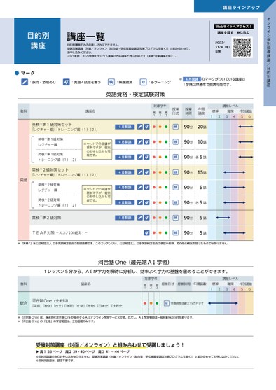 目的別講座講座一覧目的別講座のみのお申し込みはできません。受験対策講座(対面/オンライン〈総合型・学校推薦型選抜対策プログラムを除く〉)と組み合わせて、お申し込みください。2023年度、2022年度のセレクト講座の同名講座と同一内容です(英検®対策講座を除く)。2023/11/8(水)公開講座を探す・申し込むWebサイトへアクセス!●マーク:採点・添削あり:英語4技能を養う:映像授業:e-ラーニング4月開講※のマークがついている講座は1学期以降通年で受講可能です。オンライン個別指導講座/目的別講座講座ラインアップ英語資格・検定試験対策講座レベル標準難関1234特別選抜56授業形式授業時間年間講数対象学年高3高2高14月開講4月開講4月開講4月開講4月開講4月開講4月開講●●●90分20講●●●90分10講●●●90分各5講●●●90分15講●●●90分5講●●●90分各5講●●●90分5講●●●90分5講教科講座名英検準1級対策セット「レクチャー編」「トレーニング編(1)(2)」英検準1級対策レクチャー編英検準1級対策トレーニング編(1)(2)※セットでの受講が基本ですが、個別のお申し込みも可能です。英検2級対策セット「レクチャー編」「トレーニング編(1)(2)」英検2級対策レクチャー編英検2級対策トレーニング編(1)(2)※セットでの受講が基本ですが、個別のお申し込みも可能です。英語英検準2級対策TEAP対策-スコア200超え!-1レッスン5分から。AⅠが学力を瞬時に分析し、効率よく学力の基盤を固めることができます。河合塾One(最先端AⅠ学習)授業形式授業時間年間講数標準難関1234特別選抜56講座レベル対象学年高3高2高1教科講座名総合河合塾One(全教科)「英語」「数学」「古文」「物理」「化学」「生物」「日本史」「世界史」●●●受講期間は最大15カ月です*「河合塾One」は、株式会社河合塾Oneが提供するAⅠオンライン学習サービスです。ただし、AⅠ学習機能は一部対象外の科目があります。*「河合塾One」の「生物」の学習範囲は、生物基礎のみです。*「英検®」は公益財団法人日本英語検定協会の登録商標です。このコンテンツは、公益財団法人日本英語検定協会の承認や推奨、その他の検討を受けたものではありません。受験対策講座(対面/オンライン)と組み合わせて受講しましょう!▶高138ページ高239・40ページ高341〜44ページ※目的別講座のみのお申し込みはできません。受験対策講座(対面/オンライン〈総合型・学校推薦型選抜対策プログラムを除く〉)と組み合わせてお申し込みください。※目的別講座は、認定不要です。