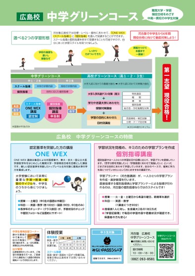 広島校中学グリーンコース難関大学・学部現役合格をめざす中高一貫校の中学生対象選べる2つの学習形態河合塾広島校では目標・レベル・個性にあわせて、「ONEWEX(スクール指導)」と「個別指導」を選んで受講することができます。スクール指導と個別指導を併せて受講することも可能ですので、自分にあった学習スタイルを見つけましょう。河合塾で中学生から6年間現役合格に向けて徹底対策しよう!第一志望現役合格!学校の進度も速いし頑張るぞ中学グリーンコース中1・2生中3生スクール指導中学の学習内容高校の学習内容個別指導目的に応じた個別指導英語数学国語スクール指導ONEWEX講座認定制個別指導個別指導講座申告制英語数学※国語は中3生のみしっかり力がついてきた実戦力つけて本番まで一直線!高校グリーンコース(高1・2・3生)大学入試に向けての基礎力強化➡大学入試に向けての実戦力強化大学入学共通テスト対策(高3)学力や志望大学にあわせた受験対策講座++学習の目的にあわせた目的別講座特別選抜難関標準個別指導総合型・学校推薦型対策英語資格・検定試験分野・テーマ別対策※2024年度カリキュラム広島校中学グリーンコースの特徴認定基準を突破した方の講座ONEWEXONEWEX講座は集団による対面授業で、東大・京大・国公立大医学部医学科をはじめとした難関大学・学部現役合格を目標とした講座です。厳しい認定基準を突破したトップレベル生を対象に最高水準の学力を養成します。学習状況を見極め、キミのための学習プランを作成個別指導講座個別指導では一人ひとりの学習状況や目標に応じて、学習プランを提案しています。「苦手分野を克服したい」「学習進度にあわせて勉強したい」といったさまざまな目的にあわせて学習していきます。自分のペースで、確実に学力を身につけていきたいという方におすすめの講座です。大学受験において非常に重要な予習→授業→復習のサイクルを、中学生のうちから身につけましょう。◆授業……土曜日(中3生の国語は木曜日)◆科目……英語・数学(各100分)・国語(90分、中3生のみ)◆各学年のチューター(クラス担任)が、予習状況のチェックや個別フォローなど全面的にサポート!学習プランナー(河合塾講師)が、一人ひとりの学習プランを作成・進捗管理を行います。直接指導する個別指導員と学習プランナーによる指導が行われるのは、河合塾の個別指導ならではのスタイルです!◆授業……火・金・土曜日から希望の曜日、時間帯を選択◆科目……英語・数学(1講座につき90分)◆指導員1人に対し、生徒最大2名の1対2方式◆「学習記録簿」で毎回の学習内容や宿題状況が確認でき、保護者の方も安心!中学生専用自習コーナー静かな環境の中で集中して自分の勉強に取り組めます。土・日も開室、授業日以外も利用可能。出欠管理出席管理を行っています。ご希望の保護者の方へは、ご登録された連絡先に入退館の時刻を随時メールでお知らせします。体験授業個別指導英語・数学1回ずつ受講可能。火曜・金曜土曜17:30〜19:0019:10〜20:4015:30〜17:0017:10〜18:4018:50〜20:20スクール指導英語・数学・国語を1回ずつ受講可能。授業日程は広島校までお問い合わせください。中3生対象中学グリーンコースWebサイト河合塾広島校中学グリーンコース●お気軽にお問い合わせください。受付時間10:00〜18:00受験できます。詳細は広島校まで。(082)263-8581